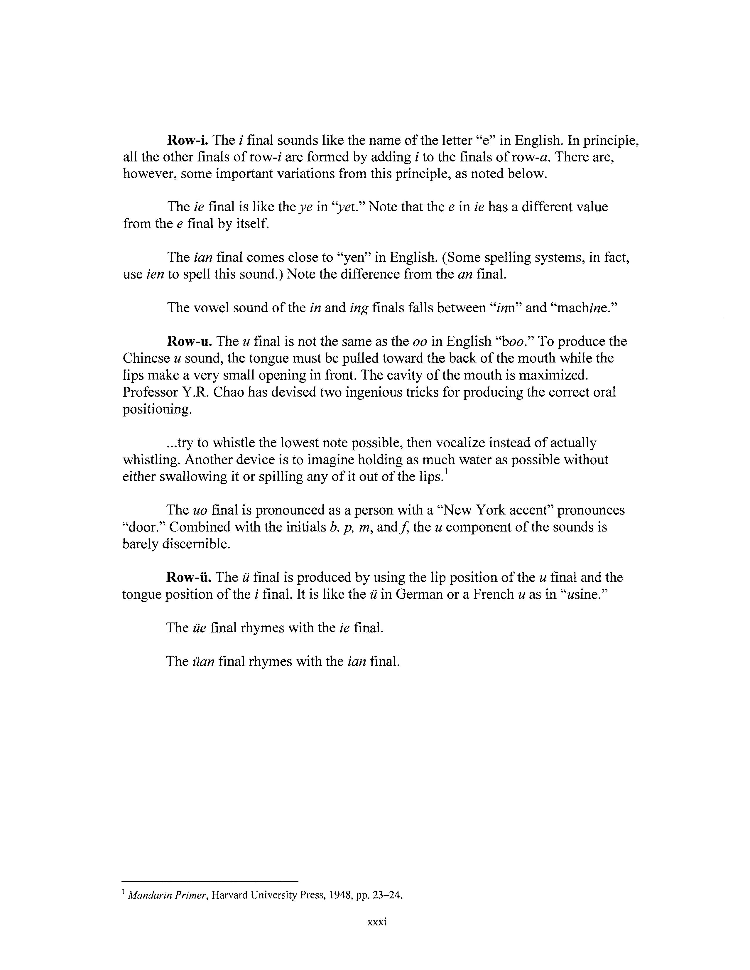Row-u. The u final is not the same as the oo in English "boo." To produce the Chinese u sound, the tongue must be pulled toward the back of the mouth while the lips make a very small opening in front. The cavity of the mouth is maximized. Professor Y.R. Chao has devised two ingenious tricks for producing the correct oral positioning .