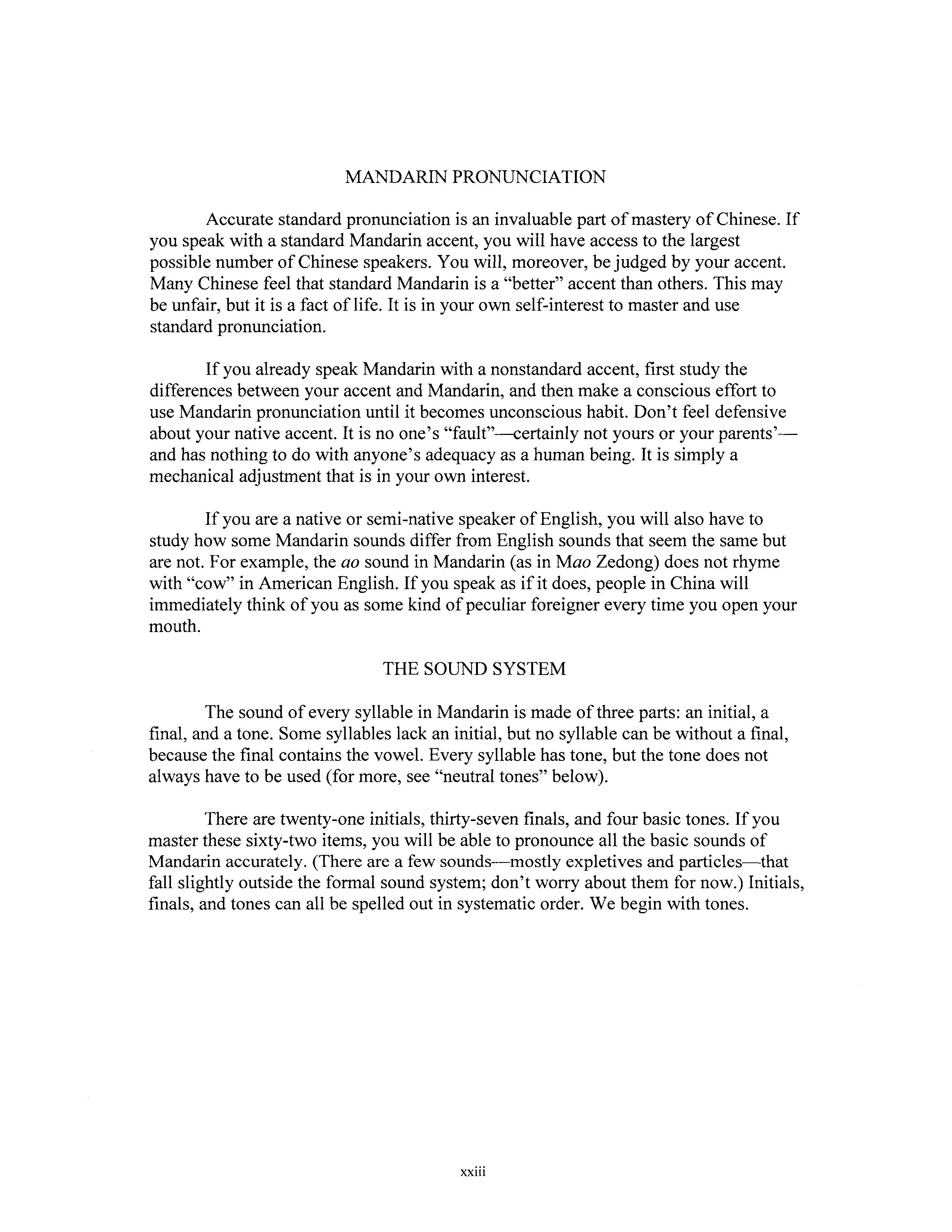 There are twenty-one initials, thirty-seven finals, and four basic tones. If you master these sixty-two items, you will be able to pronounce all the basic sounds of Mandarin accurately. (There are a few sounds-mostly expletives and particles-that fall slightly outside the formal sound system; don't worry about them for now.) Initials, finals, and tones can all be spelled out in systematic order. We begin with tones.