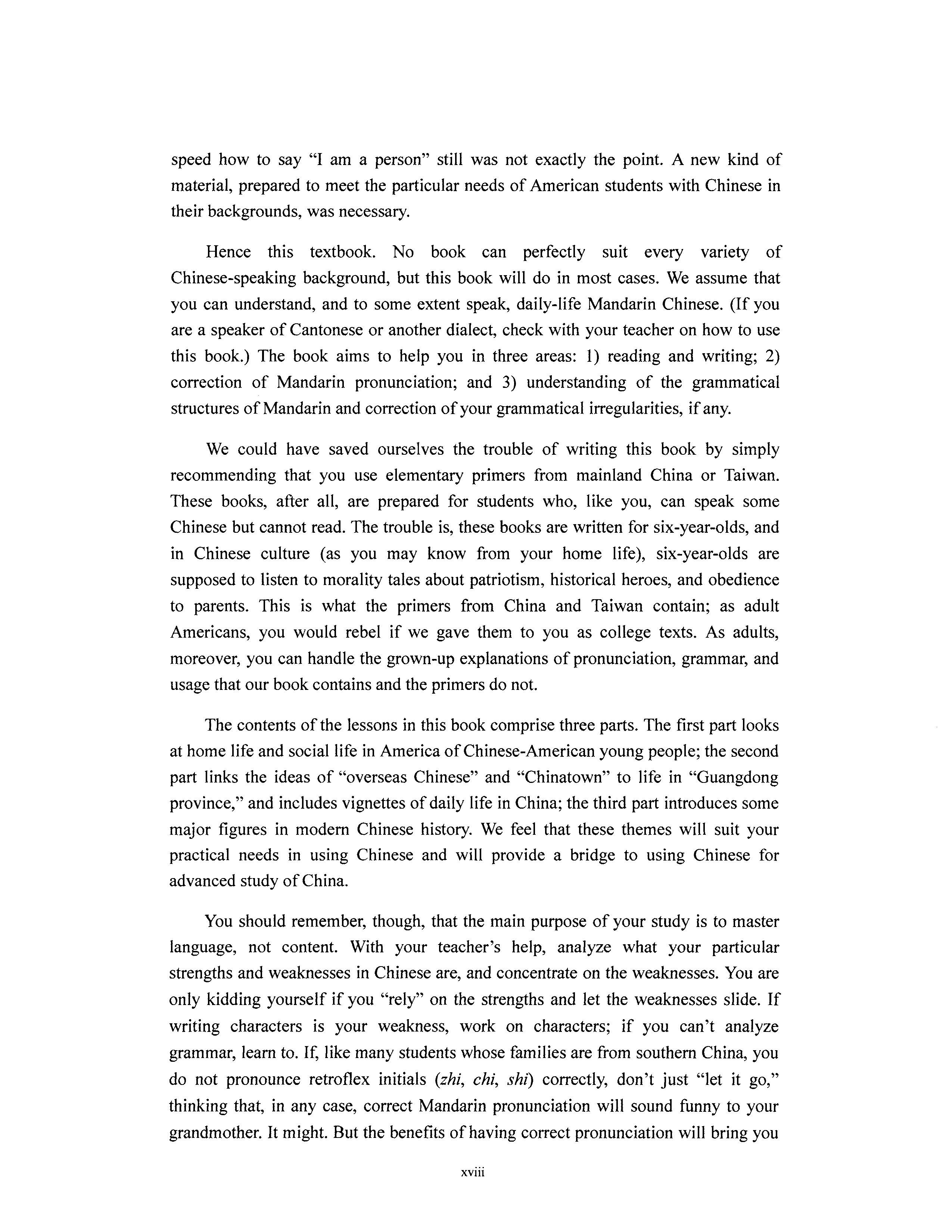 You should remember, though, that the main purpose of your study is to master language, not content. With your teacher's help, analyze what your particular strengths and weaknesses in Chinese are, and concentrate on the weaknesses. You are only kidding yourself if you "rely" on the strengths and let the weaknesses slide. If writing characters is your weakness, work on characters; if you can't analyze grammar, learn to. If, like many students whose families are from southern China, you do not pronounce retroflex initials (zhi, chi, shi) correctly, don't just "let it go," thinking that, in any case, correct Mandarin pronunciation will sound funny to your grandmother. It might. But the benefits of having correct pronunciation will bring you xviii