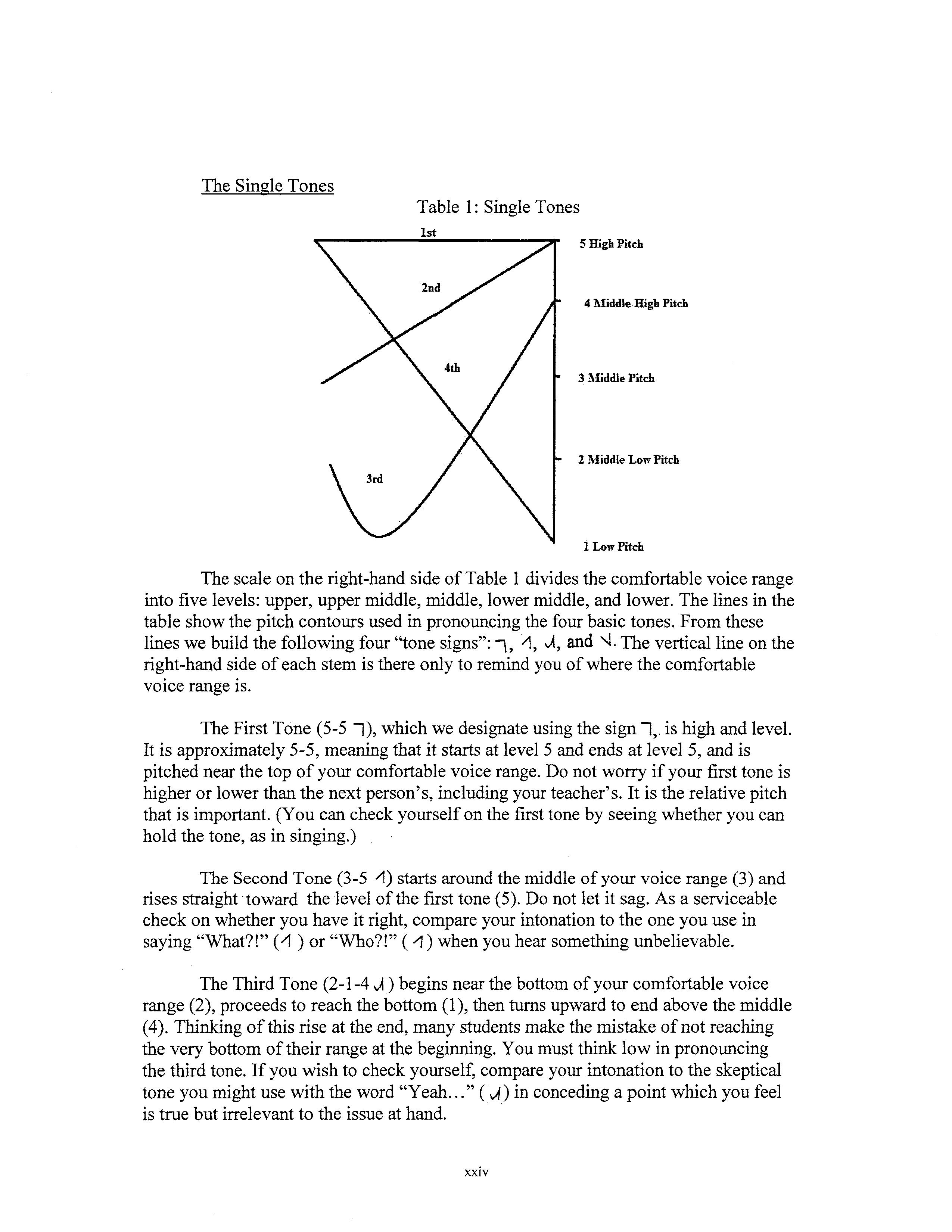 The scale on the right-hand side of Table 1 divides the comfortable voice range into five levels: upper, upper middle, middle, lower middle, and lower. The lines in the table show the pitch contours used in pronouncing the four basic tones. From these lines we build the following four ''tone signs":\, 1'\, ..A, and '-!.The vertical line on the right-hand side of each stem is there only to remind you of where the comfortable . . VOICe range IS.