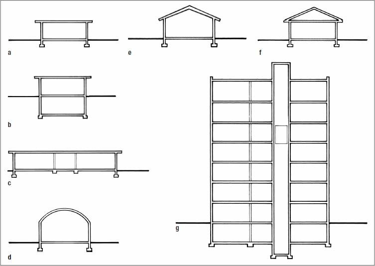 FIGURE 1 1-3 Basicbuildingtypesforotherthansingle-familyresidentialbuildings:(a)one-story;(b)one-story withbasement;(c)one-storywithmultipleframingbays;(d–f)typicalroofshapes;and(g)multistory. (DrawingbyHLS)
