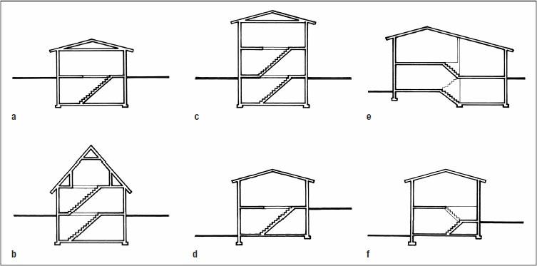 FIGURE 1 1-4 Basicsingle-familyresidentialbuildingtypes:(a)single-story;(b)one-and-one-half-story;(c)twostoryorhigher;(d)bilevel;(e)split-level;and(f)bilevel/split-entry (DrawingbyHLS)