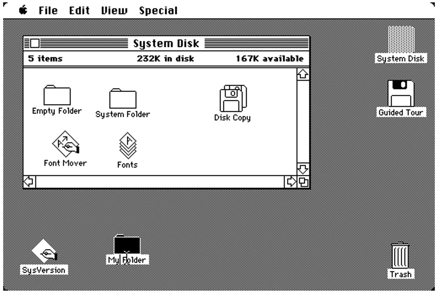 You may have noticed that I have been talking about the hardware. Unlike the other operating systems we have been talking about, Mac OS has always been tied to specific hardware. System ran on a Macintosh computer, which was designed specifically to support the sorts of things the operating system was going to do. A couple of things set it apart from the PC compatible systems that were prevalent at the time. One was that it used a Motorola 68,000 processor, unlike the Intel processors that the IBM systems were using. On top of that, it had a built in monitor that could support the type of graphics the operating system was using, which can be seen in Figure 1.5.