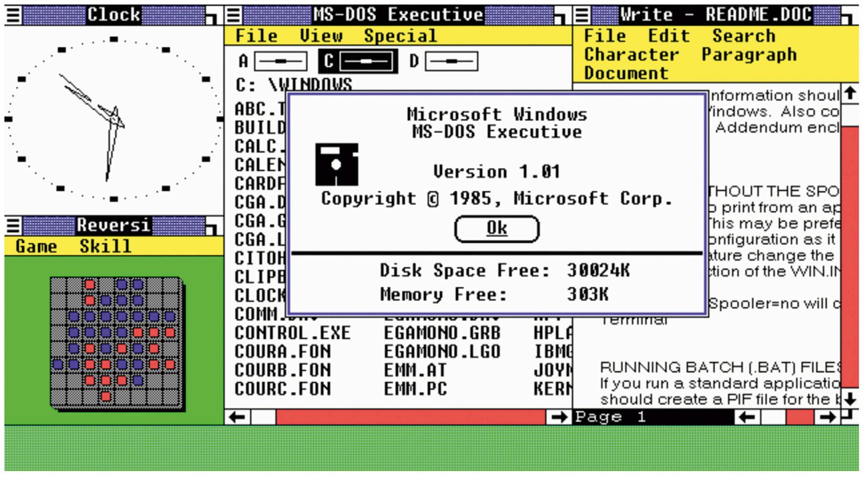 In 1982, Microsoft began work on the next generation operating system, though in fact it was really just a new user interface that sat on top of DOS, a model that would continue for the next 20 years. They called it Interface Manager initially, though eventually the name became Windows. Windows 1.0 was released in 1985 and you can see what it looked like in Figure 1.2. Windows, like DOS, came on floppy disks and the operating system was designed to read from and write to floppy disks. This would have an impact on the file system design and this would also continue to influence the file system for decades.