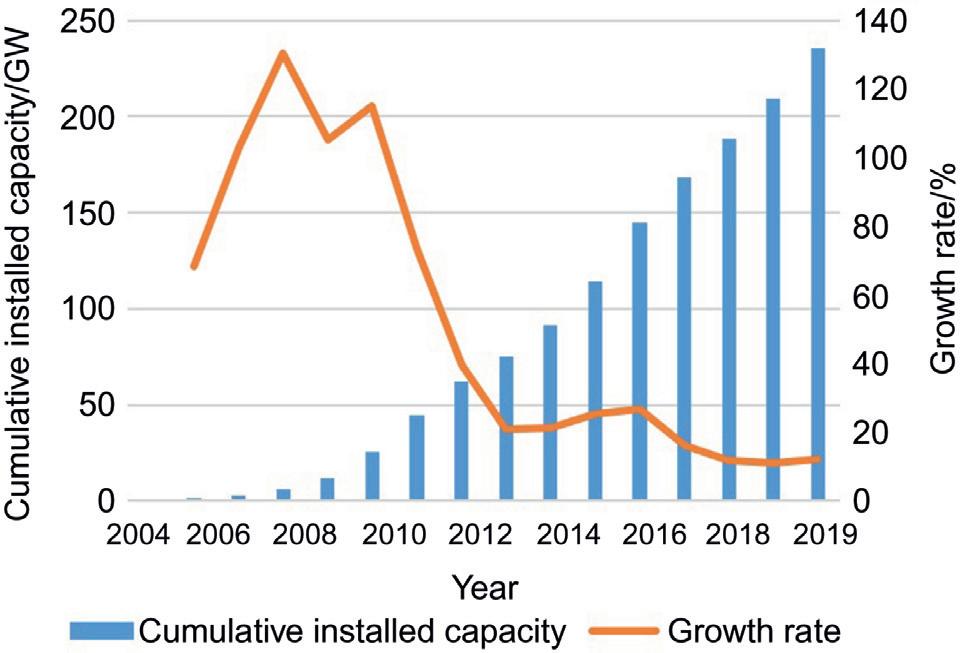 Fig.1.3 showstheproportionofonshoreandoffshorewindpower,aswell asthetotalwindpowershareofelectricitysupplyinDenmarkfrom2011 to2019.Meanwhile,solarpowerandsolarthermalenergyhaveexperienced stronggrowthinthepasttwodecades. Fig.1.4 showstheinstalledsolarpower andsolarenergycapacityfrom2010to201,whichreachedabout585GW in2019 [11]