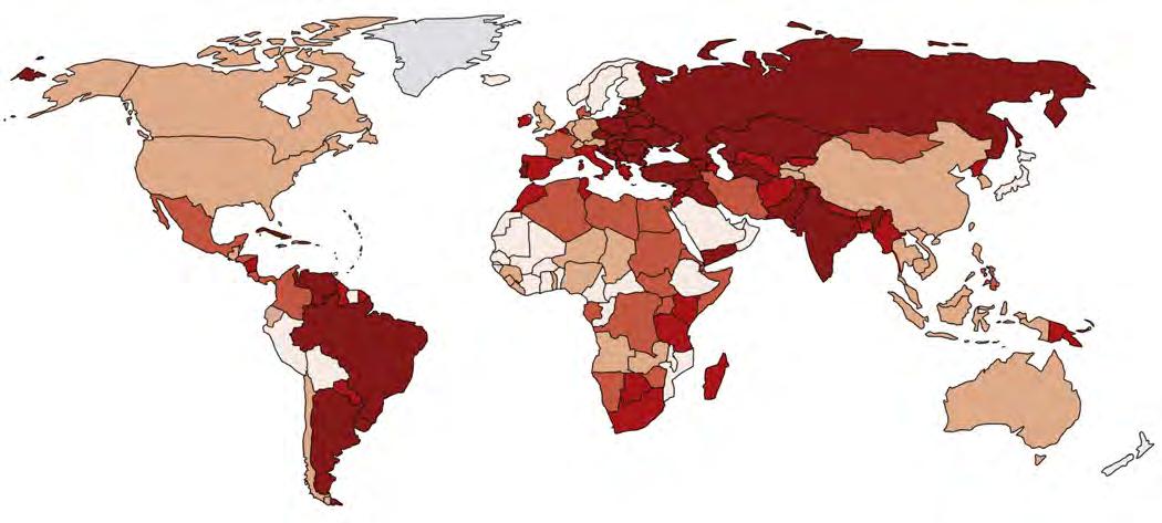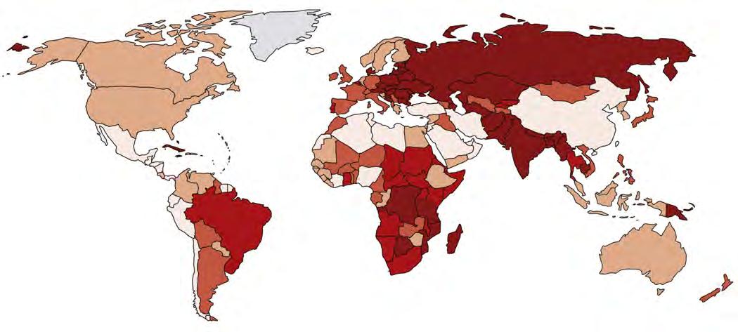 • Fig. 1.3 These two maps (shown only for males here) distort countries on the basis of the number of deaths by mouth and pharynx cancer (A), and the number of male smokers (B). They show that the public health burden is borne by Eastern Europe, Central and Eastern Asia, and South Asia. China is the major storehouse of tobacco-related morbidity and mortality in the world, a nation where more than half the population continues to smoke. Yemen, Indonesia, Mongolia, Armenia, and Kenya are the five top-ranked countries for smoking prevalence, at 77%, 69%, 69% 68%, and 67%, respectively. Territory size shows the proportion of men who smoke who live there. (From www.worldmapper.org/display_extra.php?selec ted=419. Used with permission.)