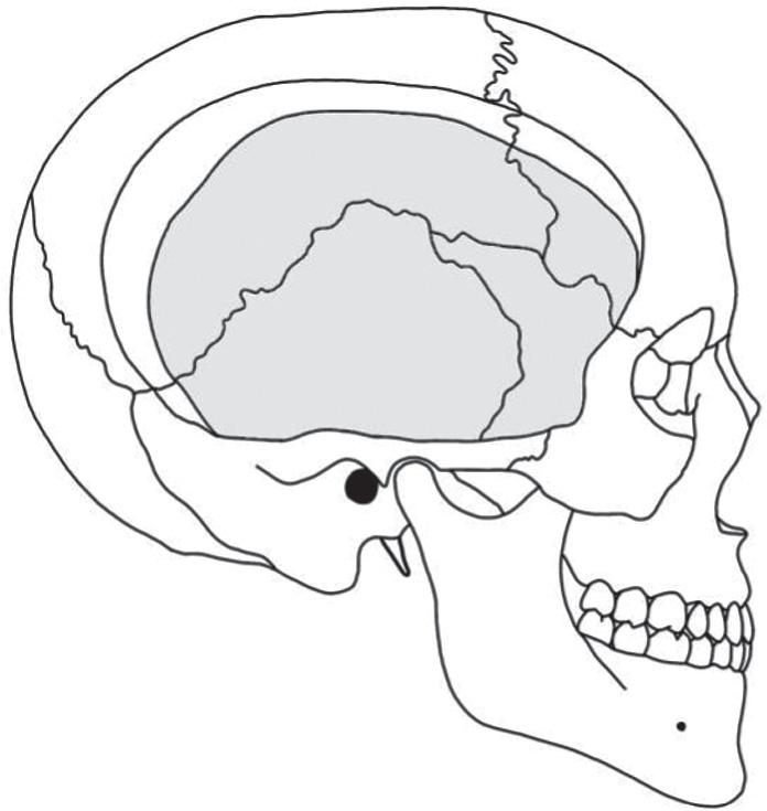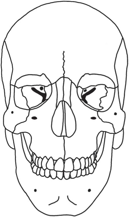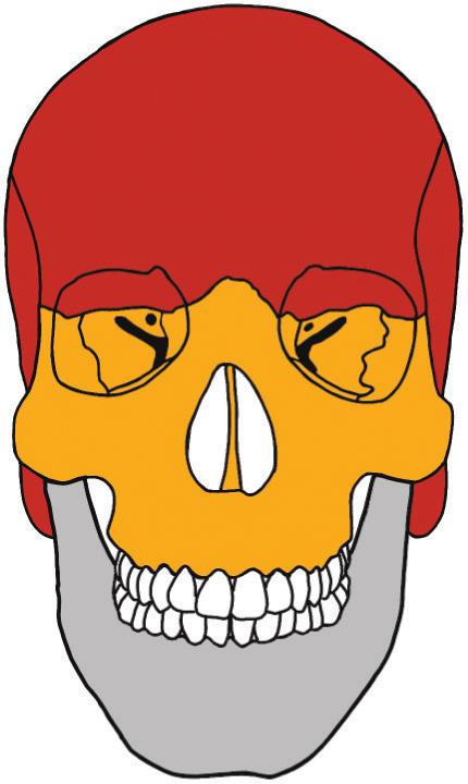 The upper third of the skull is principally formed by the frontal bones and exaggerated at the superciliary ridges of the superior orbit and smooth glabellar region centrally. The paired maxillary bones form the middle third, creating the circumference of the piriform aperture between them, and are separated from the frontal and temporal bones by the zygoma laterally on each side (Fig. 1.1a). They house the maxillary sinuses and meet in the midline inferiorly to form the upper jaw and most of the hard palate at the intermaxillary suture. The mandible forms the lower third of the frontal view (Fig. 1.1b).
