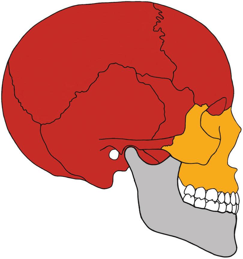 The skull without the mandible is termed the cranium and consists of the neurocranium (skull vault) and viscerocranium (facial skeleton). The precise number of bones, rather surprisingly, varies depending on the source—with some including the hyoid and ossicles and others discounting paired bones (% Fig. 1.1b, p. 5 and Fig. 1.2b, p. 7).