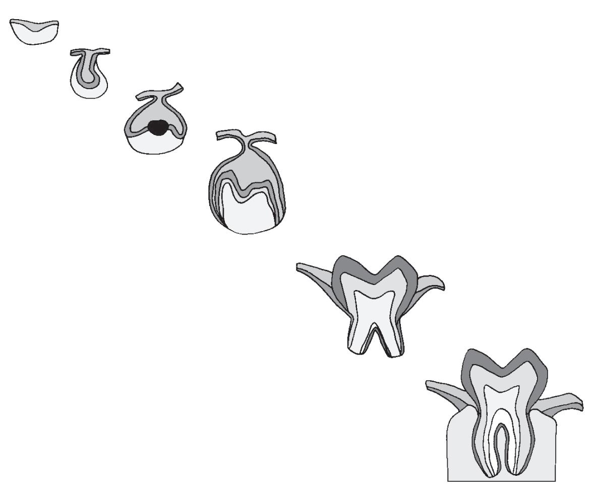 Fig. 1.2 Diagram showing developmental stages of teeth from initiation to eruption. reproduced from Scully, C. Oxford Handbook of Applied Dental Sciences (2003), with permission from oxford University Press.