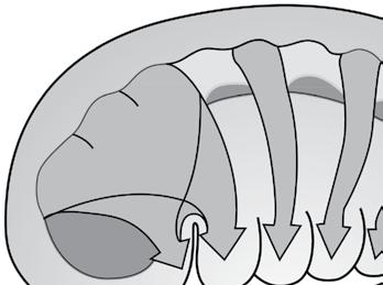 By week 4 the primitive mouth or stomatodeum is bordered laterally and from the developing heart inferiorly by the pharyngeal or branchial arches (Fig. 1.2). These are six bilateral cylindrical thickenings (although the fifth and sixth are small) which form in the pharyngeal wall and into which the neural crest cells migrate. They are separated externally by the branchial grooves and internally by the pharyngeal pouches. The first groove and pouches are involved in the formation of the auditory apparatus and the Eustachian tube.