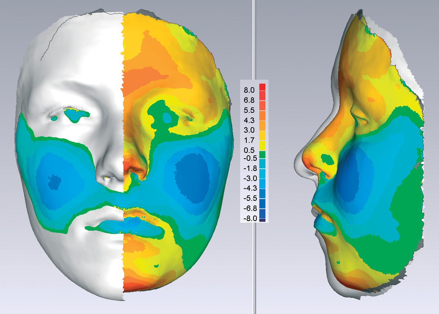 Non-invasive laser scanning or stereophotogrammetry is capable of producing photo-realistic topography of the facial soft tissues without exposure to radiation. Sequential capture is being used for longitudinal growth studies where colour mapping can help illustrate areas of maximum growth (Fig. 1.10) over a substantial time period.