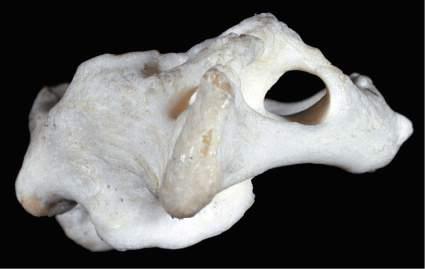 Fig. 1.14 Gross anatomic specimen of the base of the skull of a patient with severe rhematoid arthritis. Looking down into the foramen magnum from above, a bony protuberance can be seen. This upward dislocation of the odontoid process of the axis pushes the medulla and spinal cord backward. (From Kovacs G, Alafuzoff I. Handbook of Clinical Neurology. Vol. 145. Amsterdam: Elsevier; 2017: Fig. 29.9.)
