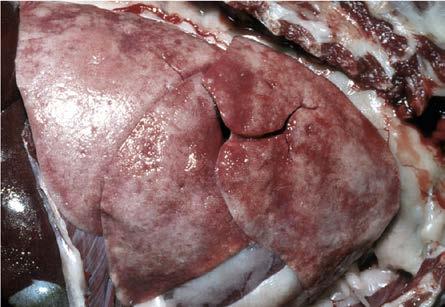 • Cranioventral hyperemic (dark red to purple) areas from acute lobular inflammation (arrows)