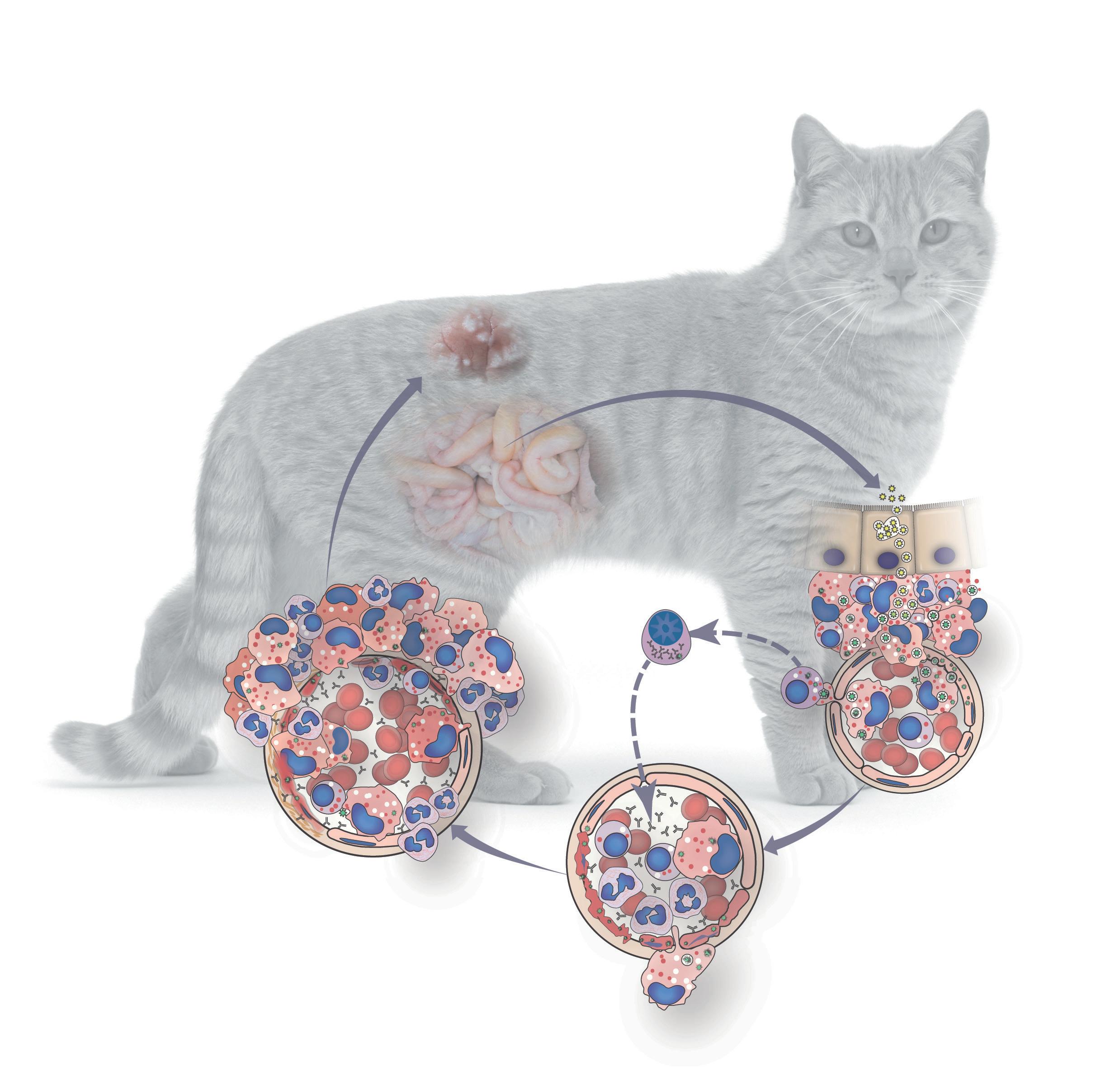 Ingestion of virus → infection of small intestinal villous epithelial cells → viral mutation → infection of and replication in macrophages → regional and systemic trafficking → macrophage activation and targeting to veins → immune recognition of virus-infected macrophages → pyogranulomatous phlebitis → pyogranulomatous vasculitis and polyserositis