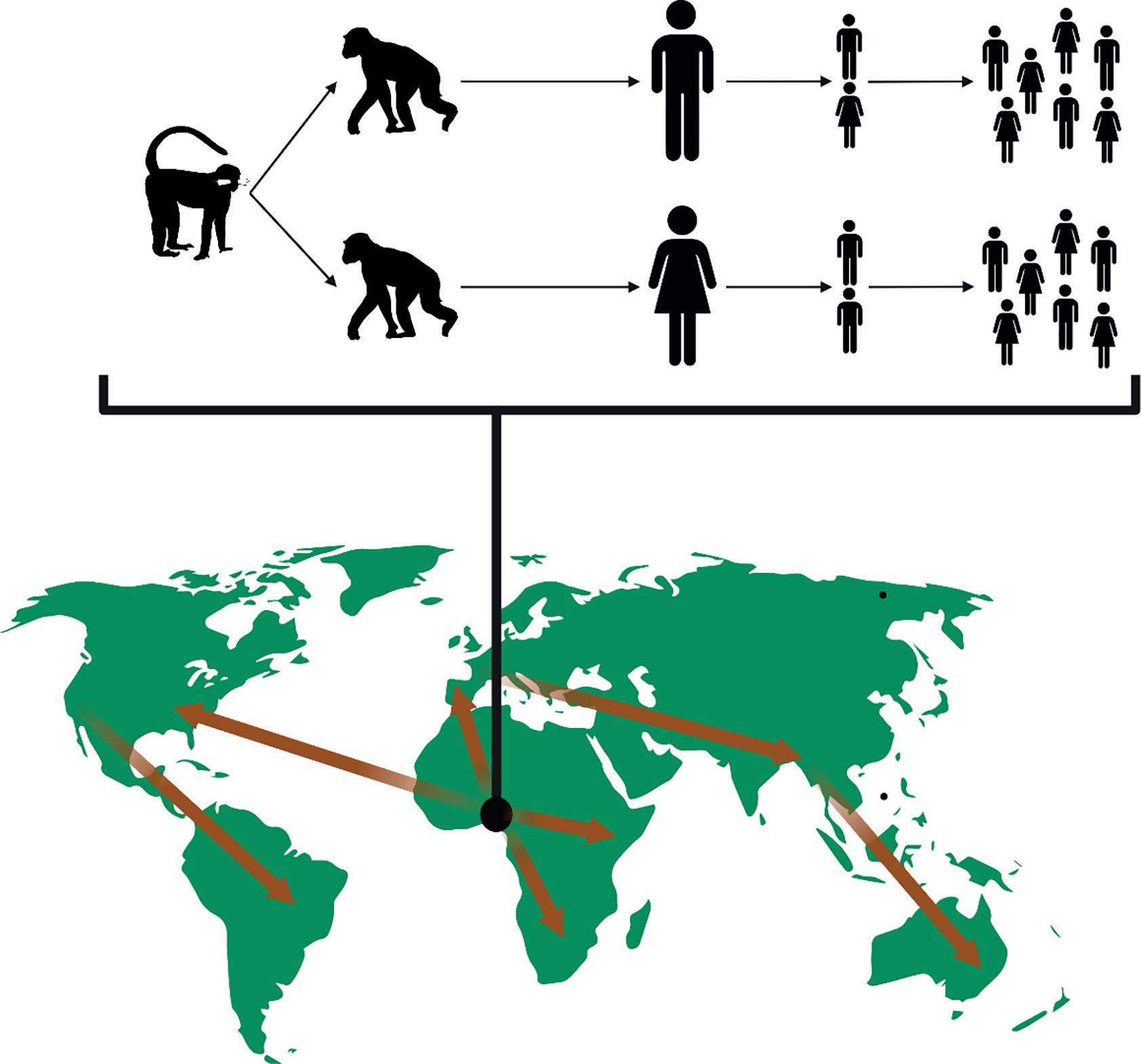 Figure1.5 Sustainablezoonosescanemergefromanimalhostsintohumanpopulations,possiblyviaa‘bridge’reservoirhost,andthenadaptto persistenttransmissionwithinhumans.Humantravelcanthenelevatethespilloverincidenttoanoutbreakandthentopandemictransmission.For example,humanimmunodeficiencyvirus-1(HIV-1)probablyjumpedfrommonkeypopulationstochimpanzeestohumans,andthechimpanzeeto-humanspilloveroccurredmorethanonce.Human-to-humantransmissionisnowresponsibleformaintainingthevirus,whichisnowpresent throughoutglobalpopulations(arrowssimplyrepresenttheconceptofglobaltravel).Similarly,SARS-CoV-2jumpedintohumanpopulationsin 2019andisnowasustainablepandemicpathogen. CreatedbyHannaD.KirylukwithBioRender.com.