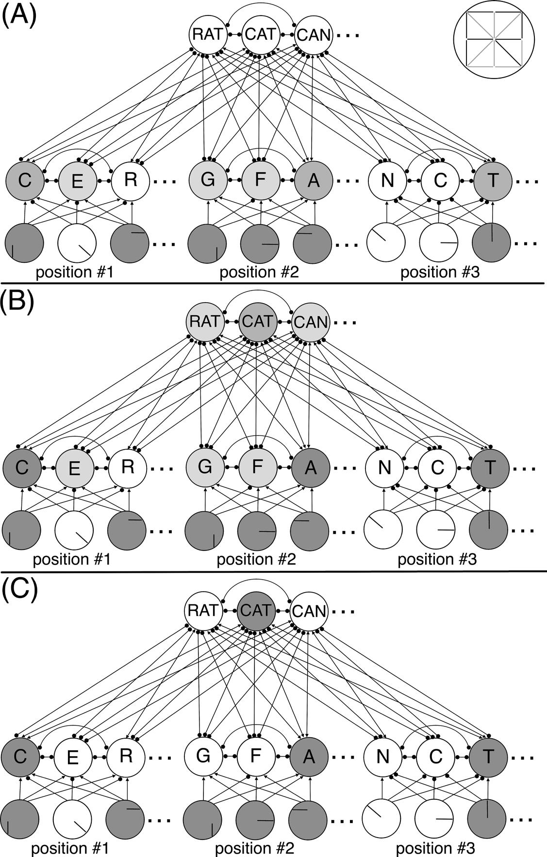 The nodes representing letter features, letters, and words are indicated, as are the excitatory (arrows) and inhibitory (circles) connections among nodes. Panels A–C show how the activation of nodes increase and decrease in their relative levels of activation (with darker gray representing more activation) in response to the word “cat” at three arbitrary points in time. The inset in the upper right of Panel A shows the full set of twenty features used in the feature nodes, with the dark gray indicating those features that would be active to represent the presence of a letter “R.”