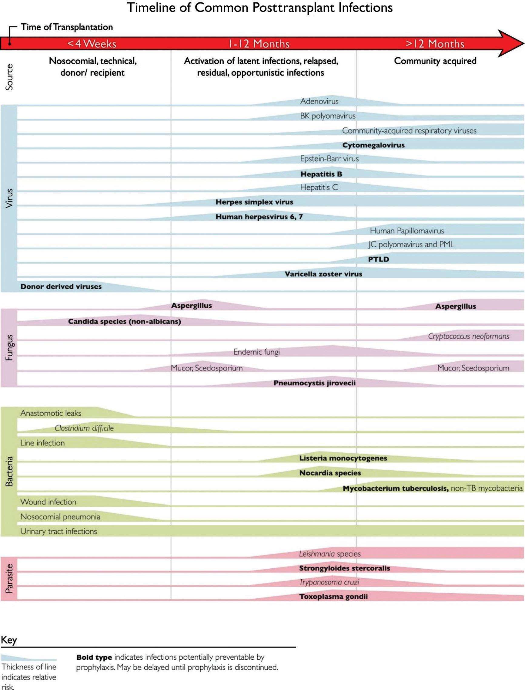 Fig. 1.2 This figure summarizes the normal timeline of infections in solid organ transplants. Increased thickness of lines denotes higher risk. (From Fishman JA, Avery RK. Chapter 94: Late Infectious Disease After Organ Transplantation in Textbook of Organ Transplantation. 1st edn. New York: John Wiley and Sons; 2014.)