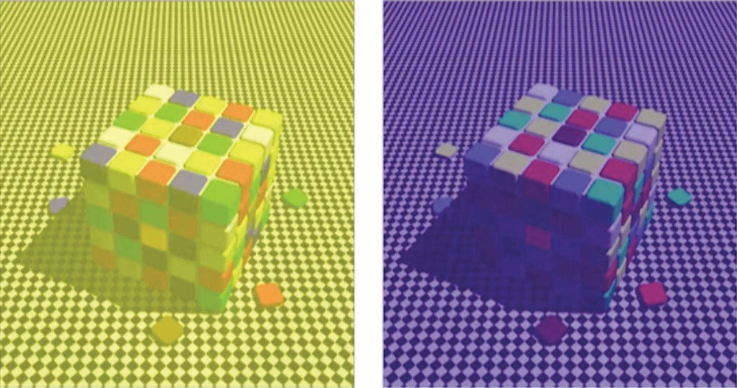 Figure 7.5. This figure illustrates one major challenge for explaining memory color as a case of color constancy. Starting with the two cube images (a), the blue tiles on the cube on the far left are actually the same shade as the yellow tiles on the cube to the right of it. Yet they are perceived as different shades because of color constancy. Importantly, nearly all humans will experience this effect. By contrast, the discolored Pink Panther (b) on the right will be experienced as pinker than it actually is only if someone has seen the Pink Panther before. Source: (a) Lotto and Purves (2002); (b) The original undiscolored image is from Witzel et al. (2011).