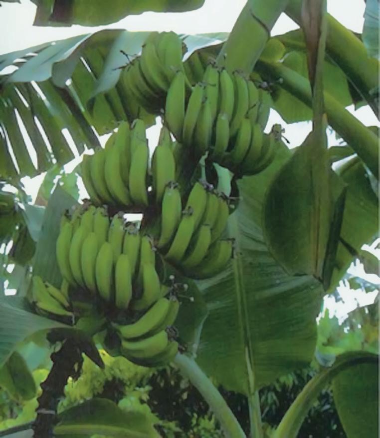 Figure 7.6. This picture shows clusters of bananas in front of a banana plant background. Several psychology studies have provided evidence that under some conditions (such as dim lighting), we see objects that have prototypical colors (such as yellow bananas) as more like their prototypical color. My claim is that this effect enables us to more easily differentiate objects from their backgrounds, such as bananas from the banana plant background in this figure. This is especially relevant in dim lighting situations. Image from http://www. banana-plants.com/index.html.