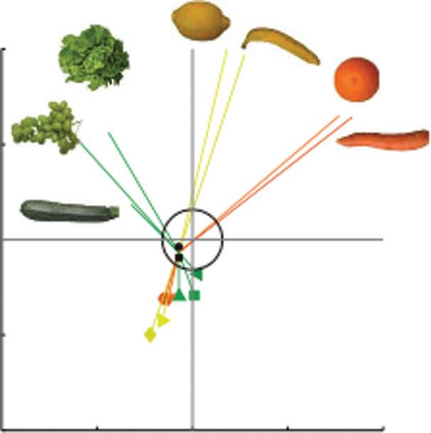 Figure 7.2. Hansen and colleagues (2006) asked participants to make fruit stimuli neutral gray, using a dial. Participants should have dialed the colors to point (0, 0) on the axes. Instead, they overshot, making the fruits closer to their opponent colors. Hansen and colleagues interpreted this result to mean that participants saw the grayed fruits as having more of their prototypical color than the fruits actually had. Source: Hansen et al. (2006).