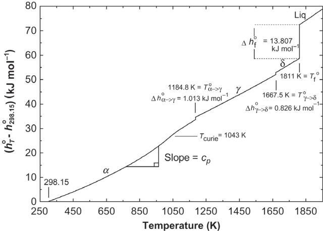 Thestandardequilibriumtemperatureoffusion(melting) ofFeis1811Kasshownin Fig.2.1.Thefusionreactionisa first-orderphasechange sinceitoccursatconstanttemperature. Thestandardmolarenthalpyoffusion Δhf o is13.807kJmol 1 asshownin Fig.2.1 .Itcanalsobeseenin Fig.2.1 thatFe undergoestwootherfirst-orderphasechanges,thefirstfrom α (bcc)to γ (fcc)Feat T α!γ o ¼ 1184.8Kandthesecondfrom γ to δ (bcc)at1667.5K.Theenthalpychangesare,respectively, 1.013and0.826kJmol 1.TheCurietemperature, Tcurie ¼ 1045K, whichisalsoshownin Fig.2.1,willbediscussedinChapter10. Hence,forexample,theenthalpychangeuponheating1.0mol ofpureFefrom298.15Ktoatemperature T abovethemelting pointisgivenas