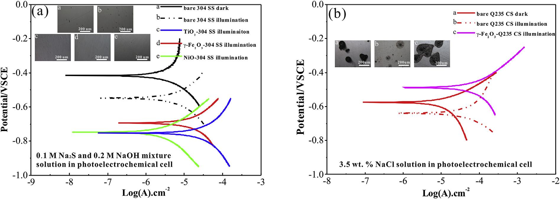 currentofthemetal.Photocurrentcan’tbedistinguishedfrom corrosioncurrentinthepotentiodynamicpolarizationcurves.TiO2 andg-Fe2O3 providephoto-inducedprotectionforthecoupled304 SSasillustratedbythepotentialanalysisandsurfacemorphology. Theincreased Icorr wascausedbythephotocurrentofthen-type semiconductors.Thep-typeNiO-304SScouplingelectrodeexhibits theminimum Icorr astheweakphotovoltaiceffectofNiO.Inaddition,thecorrosionpotentialofbareQ235CSindarkandunder illuminationin3.5wt%NaClsolutionis 0.58and 0.64VSCE, respectively.Thecorrosionpotentialof g-Fe2O3 andQ235CS couplingelectrodeis 0.48VSCEwithirradiation.Thecorrosion pitsmorphologyandpotentiodynamicpolarizationcurvessuggest thatthecorrosionprocessofQ235CSisacceleratedby g-Fe2O3
