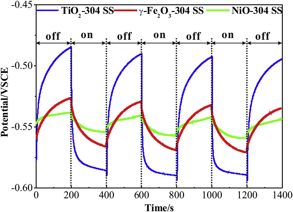 TheanataseTiO2,maghemite-Q g-Fe2O3, andNiOnanoparticles aresynthesized,asconfirmedbythex-raydiffraction(XRD)patternsandtransmissionelectronmicroscopy(TEM)morphology analysisin Fig.S1.TheOCPcurvesofthepreparedsamplescoupled with304SSin0.1MNa2Sand0.2MNaOHmixturesolutionwere thentested,asillustratedin Fig.2.Photogeneratedelectrons transferfromsemiconductorstometalinducesthepotential decreaserapidlywhenxenonlampirradiationisswitchedon [41,42].Meanwhile,thephotogeneratedholescaptureelectrons fromtheelectrolyte.TheOCPreachesa finalsteady-statevalue (photo-inducedvoltage)untiltheelectronmigrationandthe electrolytereactionapproachequilibrium.Theaveragevoltage differencebetweenlightanddarkstateinthreelightson-offcycle isrepresentedasphoto-inducedvoltagedrop,whichisusedto qualitativelycharacterizephoto-inducedprotectionorcorrosion. Thephoto-inducedvoltagedropisanimportantparameterto evaluatethephoto-inducedprotectionperformance[27,33].The TiO2 and g-Fe2O3 electrodesexhibitanaveragevoltagedrop of 100mVand 38mV,respectively,whileNiOexhibitsan averagevoltagedropof 17mVasahole-typesemiconductor.The photo-inducedvoltagedropincreasemeansmoreelectrontransfer fromthesemiconductortotheconnectedmetal,resultinginbetter photo-inducedprotection.