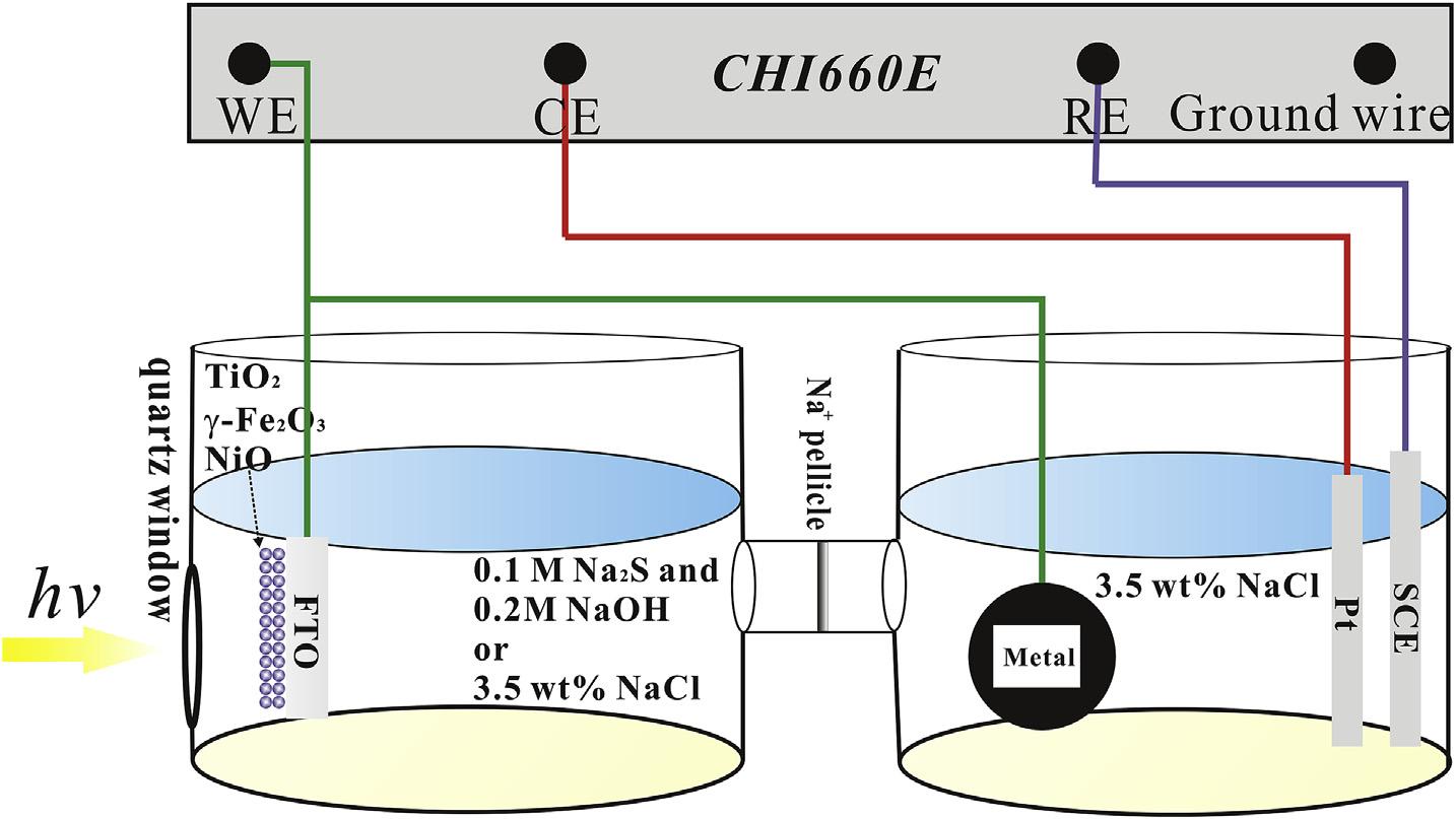Photoelectrochemicalperformancewasmeasuredwithathreeelectrodesystemonanelectrochemicalworkstation(CHI660E, ShanghaiChenhuaInstrumentCo.Ltd,Shanghai,China).The referenceelectrodeandcounterelectrodeweresaturatedcalomel electrode(SCE)andplatinumelectrode,respectively.Aschematic illustrationoftheexperimentalsetupfortheelectrochemicaltestis shownin Fig.1.Removalofplatinumelectrodewasonlyusedinthe OCPtest[39,40].Thephotoelectrochemicalcellwiththephotoelectrodeandthecorrosioncellwiththemetalelectrodewere connectedbysodiumionsemipermeablemembrane.Then,0.2M NaOHcontaining0.1MNa2Sredoxsolutionand3.5wt%NaClsolutionwereusedinthephotoelectrochemicalcell,while3.5wt% NaClsolutionwerealwaysusedinthecorrosioncell.TheS2 was usedasaphotogeneratedholes scavengertoimprovephoto quantumefficiencyofthephotoelectrode,andNaOHcouldinhibit thehydrolysisofS2 .A3.5wt%NaClsolutionwasusedtosimulate aseawaterenvironment.Thephotoelectrodeandthemetalelectrodewereconnectedoutsidebycopperwire,whichwasusedas theworkelectrode.A300Wxenonlampwith350nm 780nm wavelengthwithpowerenergydensity ¼ 1W/cm2 (CEL-HXF300, BeijingZhongjiaojinyuanTechnologyCo.Ltd.,China)wasusedasa lightsource.Thepotentiodynamicpolarizationcurvesweretested inapotentialrangeof 1 1VSCEwith0.01V/sscanrate.MottSchottkyplotswerethencarriedoutin0.5MNa2SO4 solutionat thefrequencyof5Hzby5mValternatingcurrentamplitude.