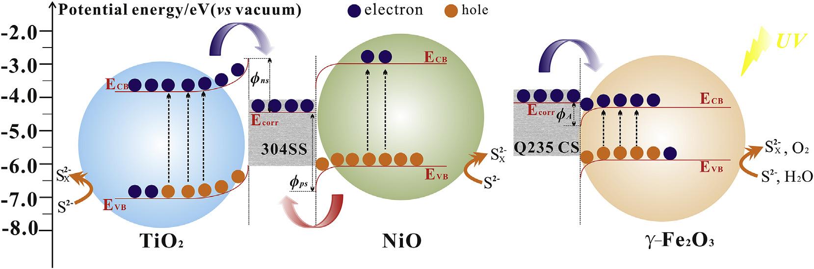 TiO2 andNiOishigherthanthecorrosionpotentialof304SSand Q235CS,while g-Fe2O3 ishigherthanthatof304SS.Forn-type semiconductorTiO2 and g-Fe2O3,whenthesemiconductorand304 SSareconnectedelectricallytoconstructanewelectronsystem, electronsintheconductionbandspontaneously flowtothemetal fromthesemiconductorbeforelightson.Thisoccursuntilthe systemreachesabalancedFermilevel.Thusthemetalsurfaceacquiresmoreelectronsduetothenegativechargeaccumulation.In addition,theelectronmigrationawaycausesanexcesspositive chargeinthesemiconductor,leadingtotheformationofaninner electric fieldinthesemiconductor-metalheterojunction.The semiconductorsurfacebandenergybendsupward[12].The electron-depletedlayerformsatthesemiconductorsidewhilethe Schottkybarrier(Øns)formsintheheterojunctioninterface[31]. Consequently,one-wayelectronmigrationfromsemiconductorto metalwilloccurinthesemiconductor-metalheterojunction.When lightison,Schottkybarrierandthepotentialdifferenceoftheinner electric fieldincreasealongwiththepotentialofthesemiconductor decreases[41]. Thephotogeneratedelectronsintheconduction bandmigratethroughtheelectron-depletedlayertothecoupled metal,resultinginphoto-inducedprotection.Theelectronpotential inTiO2 and g-Fe2O3,whichisequalto ECB,is 3.85and 4.30eV vs vacuum,respectively,asshownin Fig.9.ThustheSchottkybarrier andtheinnerelectric fieldinTiO2-304SSjunctionishigherthan thatin g-Fe2O3-304SSjunction.Thisindicatesmoreelectron transferandbetterphoto-inducedprotection,whichisconsistent withtheresultsofphotoelectrochemicalperformanceandcorrosionmorphology.
