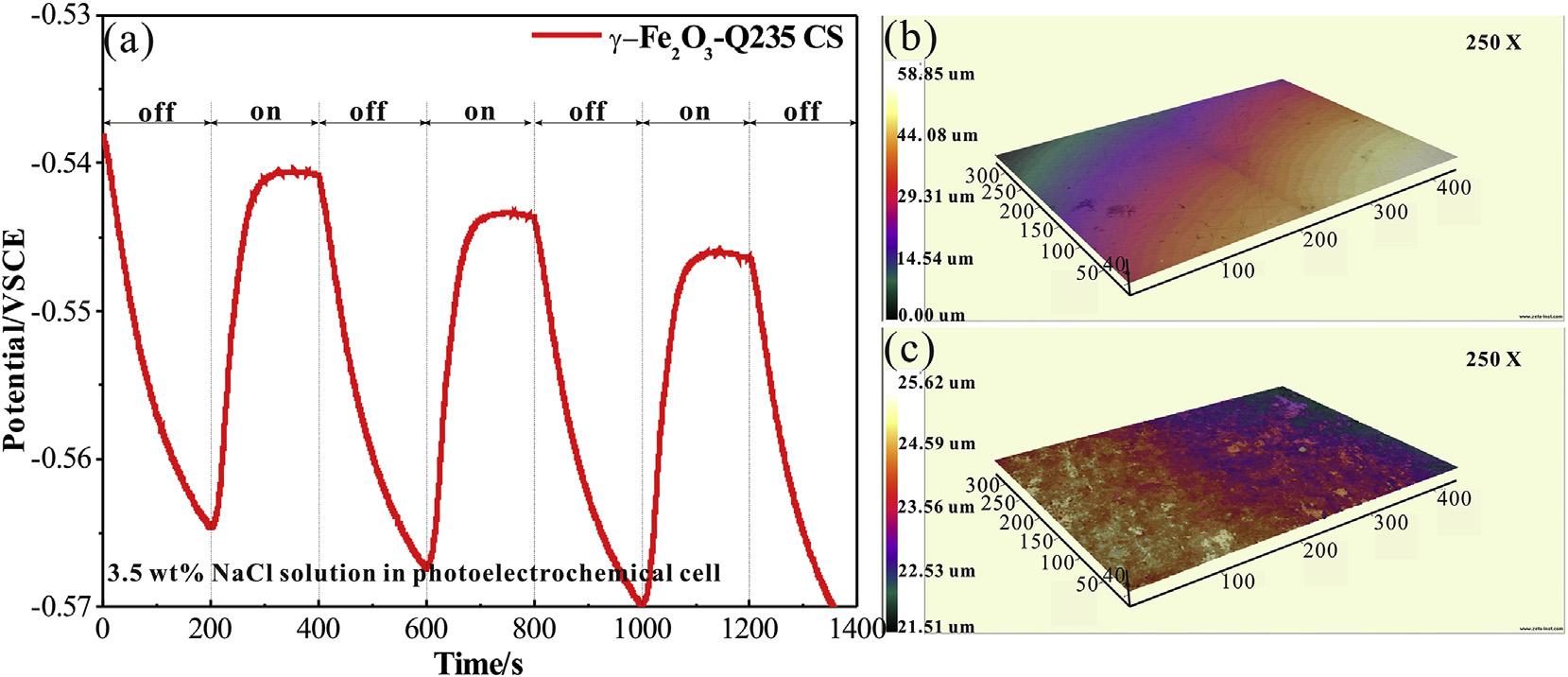 Fig.4. OpencircuitpotentialofgalvaniccoupleofQ235carbonsteelwith g-Fe2O3 in3.5wt%NaClsolutionwiththexenonlampirradiationonandoffintermittently(a).The3D surfacemorphologyofQ235CScouplingwith g-Fe2O3 in3.5wt%NaClsolutionwithout(b)andwith(c)irradiationfor40min. Y.Xuetal./JournalofAlloysandCompounds817(2020)152746