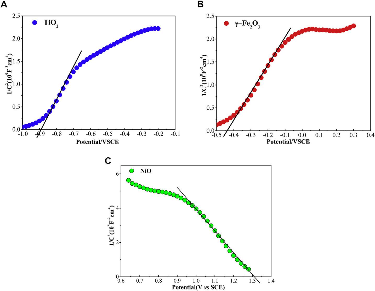 TheM SplotsofTiO2, g-Fe2O3,andNiOareprovidedin Fig.7. PositiveslopesareobservedintheTiO2 and g-Fe2O3 plots, demonstratingthatthepreparedTiO2 and g-Fe2O3 aren-type semiconductors.Forp-typesemiconductorNiO,onlyanegative slopeisobserved.The flatbandpotentialcanbeestimatedbythe linearpartsofthecurvesextrapolatingtheplotsto1/C2 ¼ 0,which is 0.89, 0.44,and1.31VSCE(equalto 3.85, 4.30, 6.07eV vs vacuum,respectively)forTiO2, g-Fe2O3,andNiO,respectively.For n-typesemiconductor,the flatbandpotentialisapproximately equaltotheconductionbandbottom(ECB)andforp-typesemiconductorequaltothevalencebandtop(EVB)[52].