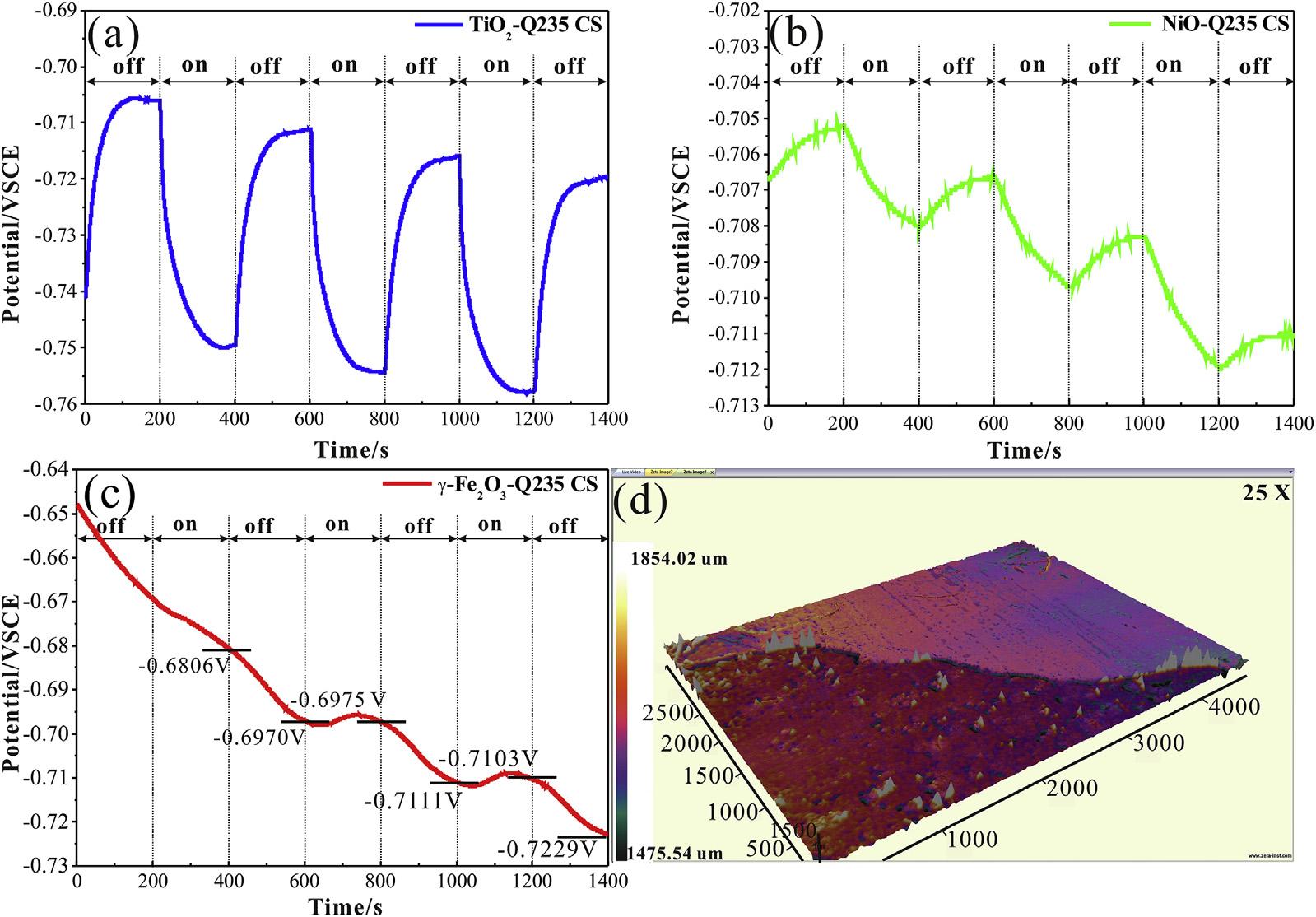 Fig.3. OpencircuitpotentialofgalvaniccoupleofQ235carbonsteelwithTiO2 (curvea), g-Fe2O3 (curveb)andNiO(curvec)in0.1MNa2Sand0.2MNaOHmixturesolutionwith thexenonlampirradiationswitchedonandoffintermittently.The3DsurfacemorphologyofQ235CS(d)couplingwith g-Fe2O3 in0.1MNa2Sand0.2MNaOHmixturesolution withirradiationfor40min.