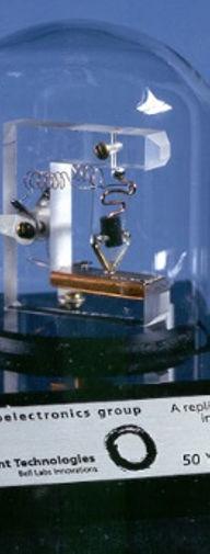 The experimental demonstration began in 1947 with American physicists John Bardeen, Walter Brattain and William Shockley who made the first point contact transistor (Figure 1.2). Working at Bell Labs, they were looking for a solution to replace the vacuum tubes which were not very reliable, consumed too much power and produced too much heat to be practical for AT&T’s markets. They were jointly awarded the Nobel Prize in Physics in 1956 for their achievement [NOB 47].