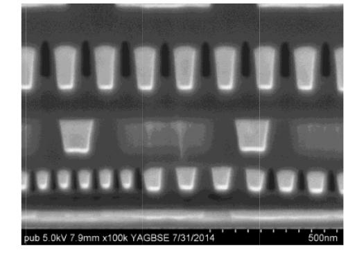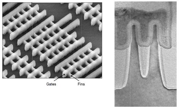 Figure 1.10. Left: top-down SEM observation of Intel 22 nm FinFET technology (from http://www.intel.com/content/www/us/en/silicon-innovations/intel-22nmtechnology.html). Middle: 14 nm Fin cross-section. Right: first metal levels cross-section (from S. Natarajan [NAT 14])