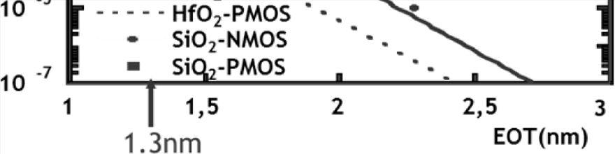 Figure 1.6. Gate leakage as a function of gate voltage for SiO2 and HfO2 gate oxides. The effectiveness of HfO2 introduction is illustrated by a 4-decades reduction of the gate current at a given equivalent oxide thickness (EOT) as compared to SiO2 reference (from B. Guillaumot et al. [GUI 02])