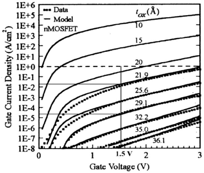 Figure 1.5 shows how gate leakage becomes the main contributor to leakage current when the equivalent oxide thickness was scaled down in the 1.5 nm range.
