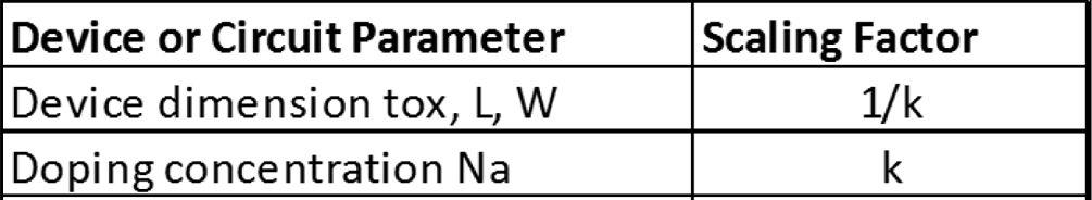 Table 1.1 is reproduced from Dennard’s paper and summarizes transistor or circuit parameter changes under ideal scaling conditions, where k is the unitless scaling constant [DEN 74].