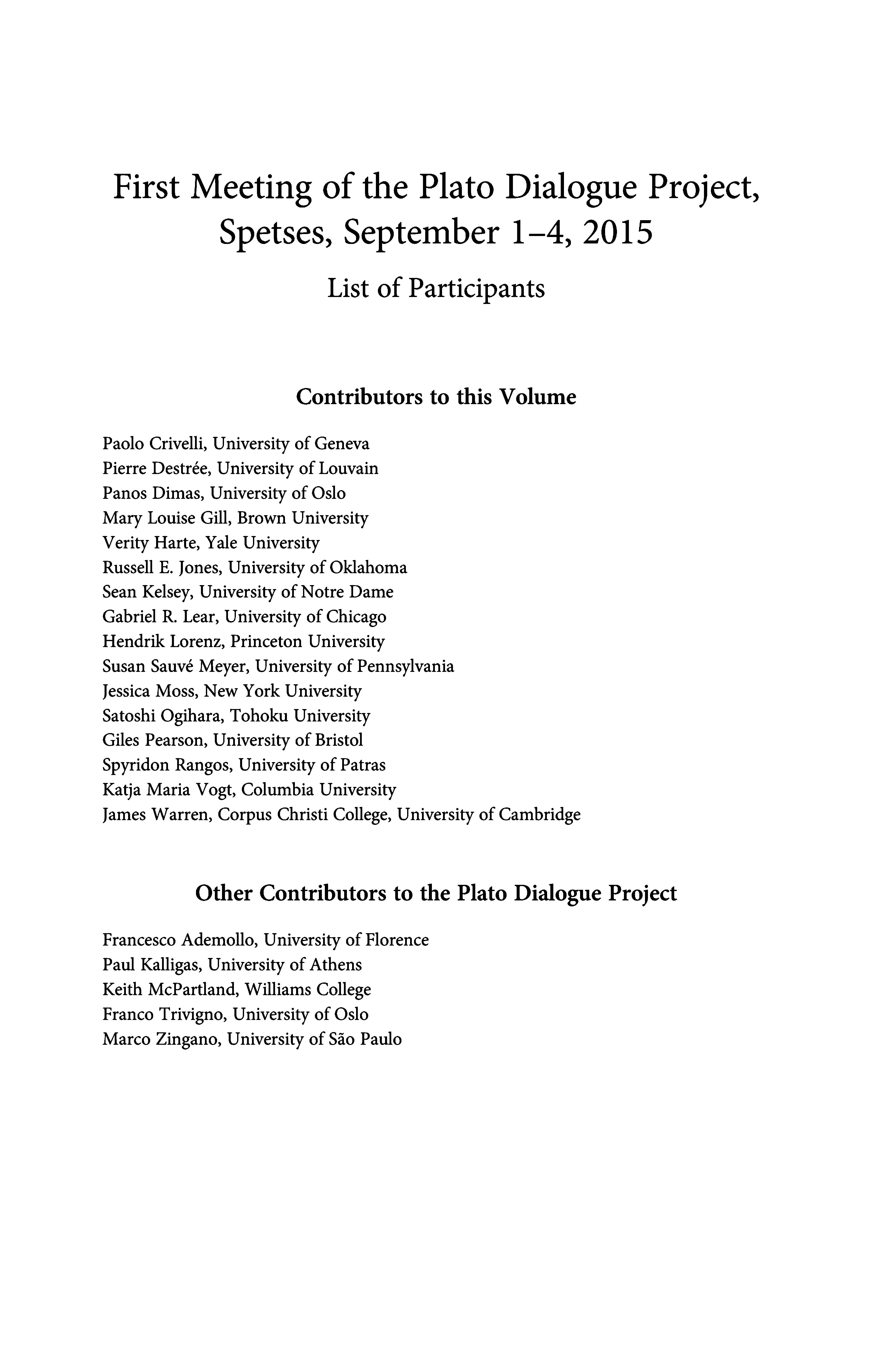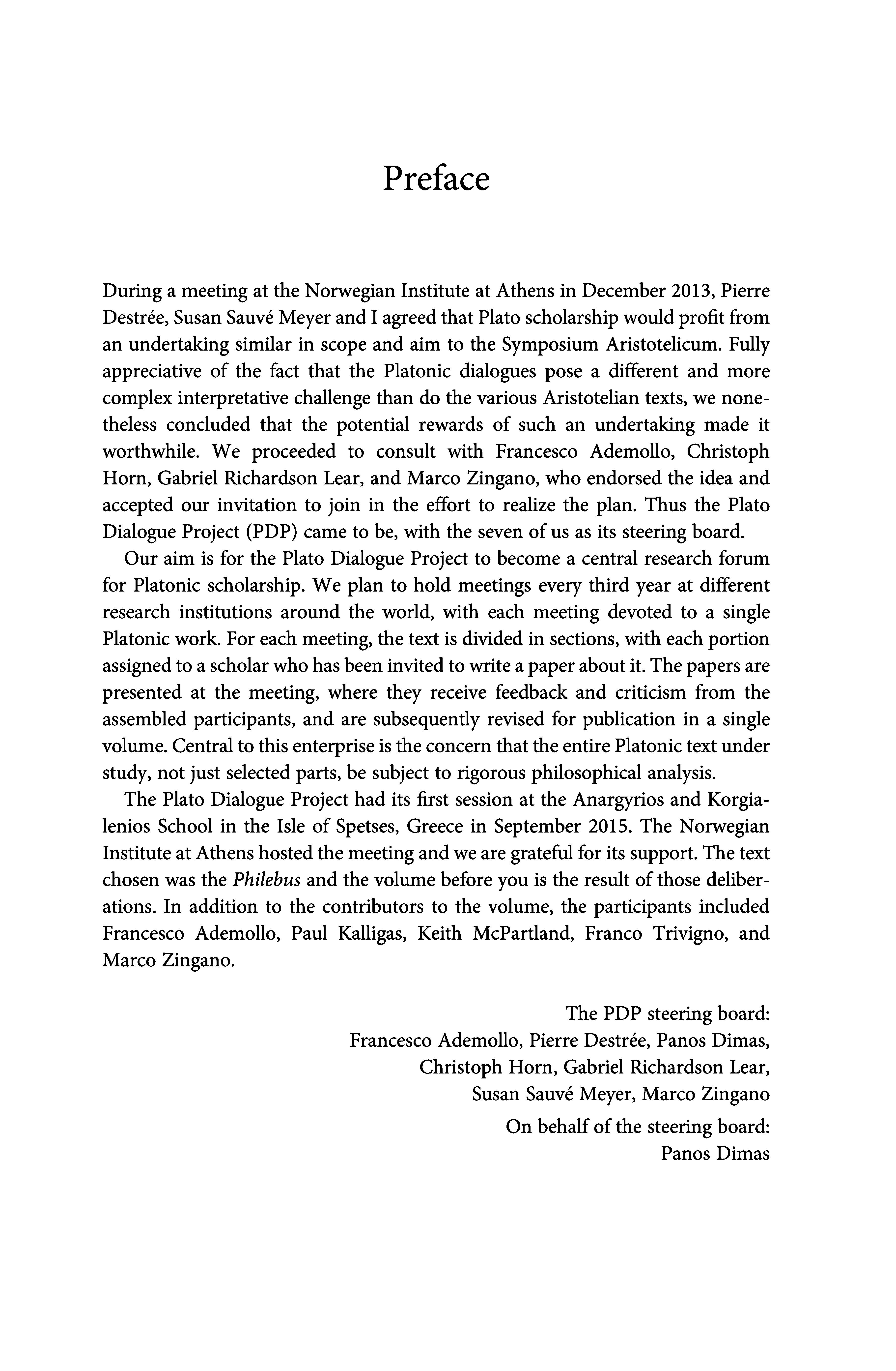 During a meeting at the Norwegian Institute at Athens in December2013,Pierre Destrée, Susan Sauvé MeyerandI agreedthat Plato scholarship wouldprofitfrom an undertaking similar in scope and aim to the Symposium Aristotelicum. Fully appreciative of the fact that the Platonic dialogues pose a different and more complex interpretative challenge than do the various Aristotelian texts, we nonetheless concluded that the potential rewards of such an undertaking madeit worthwhile. We proceeded to consult with Francesco Ademollo, Christoph Horn, Gabriel Richardson Lear, and Marco Zingano, who endorsed the idea and accepted our invitation to join in the effort to realize the plan. Thus the Plato Dialogue Project (PDP) cameto be, with the seven ofusas its steering board.