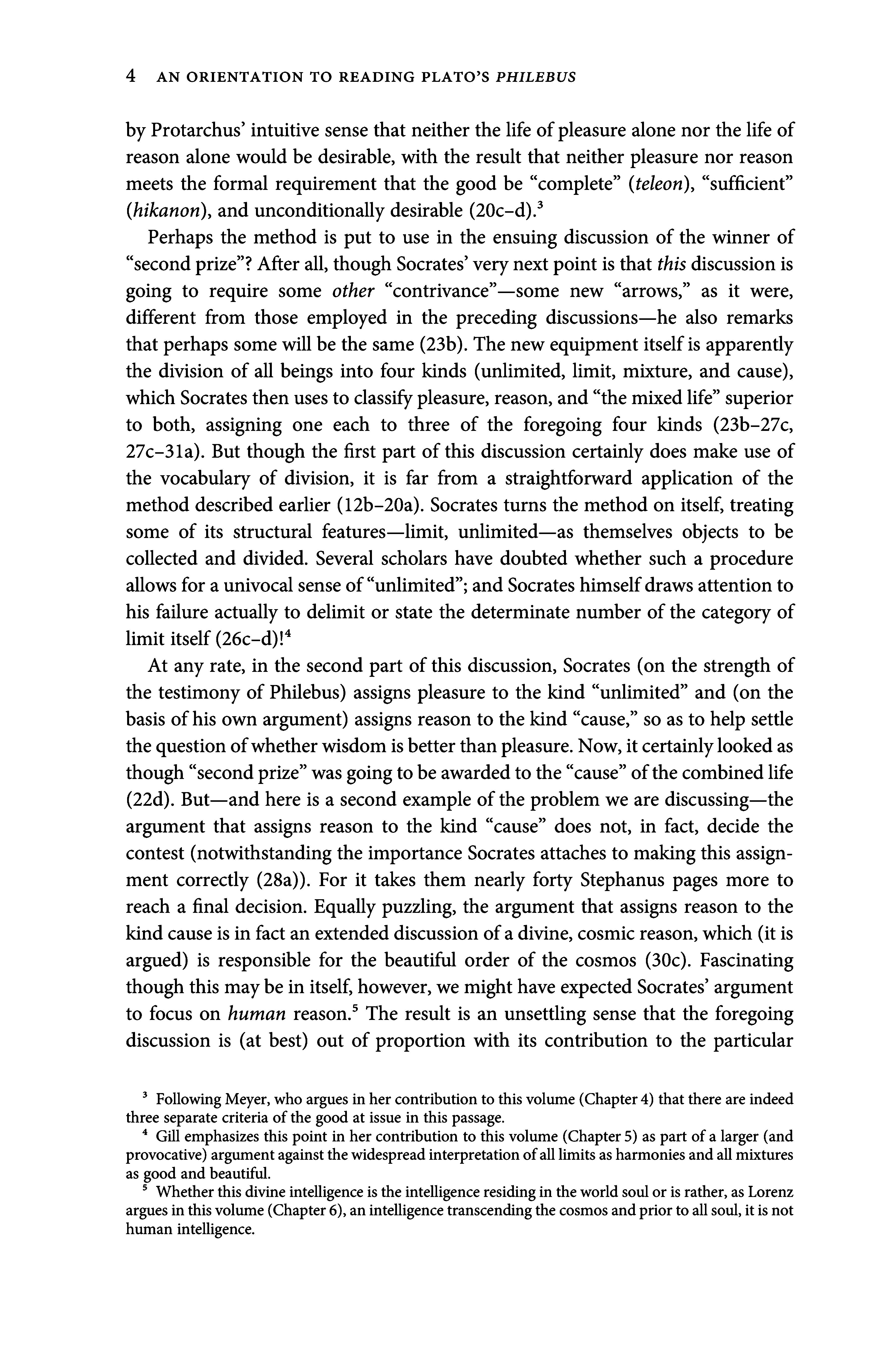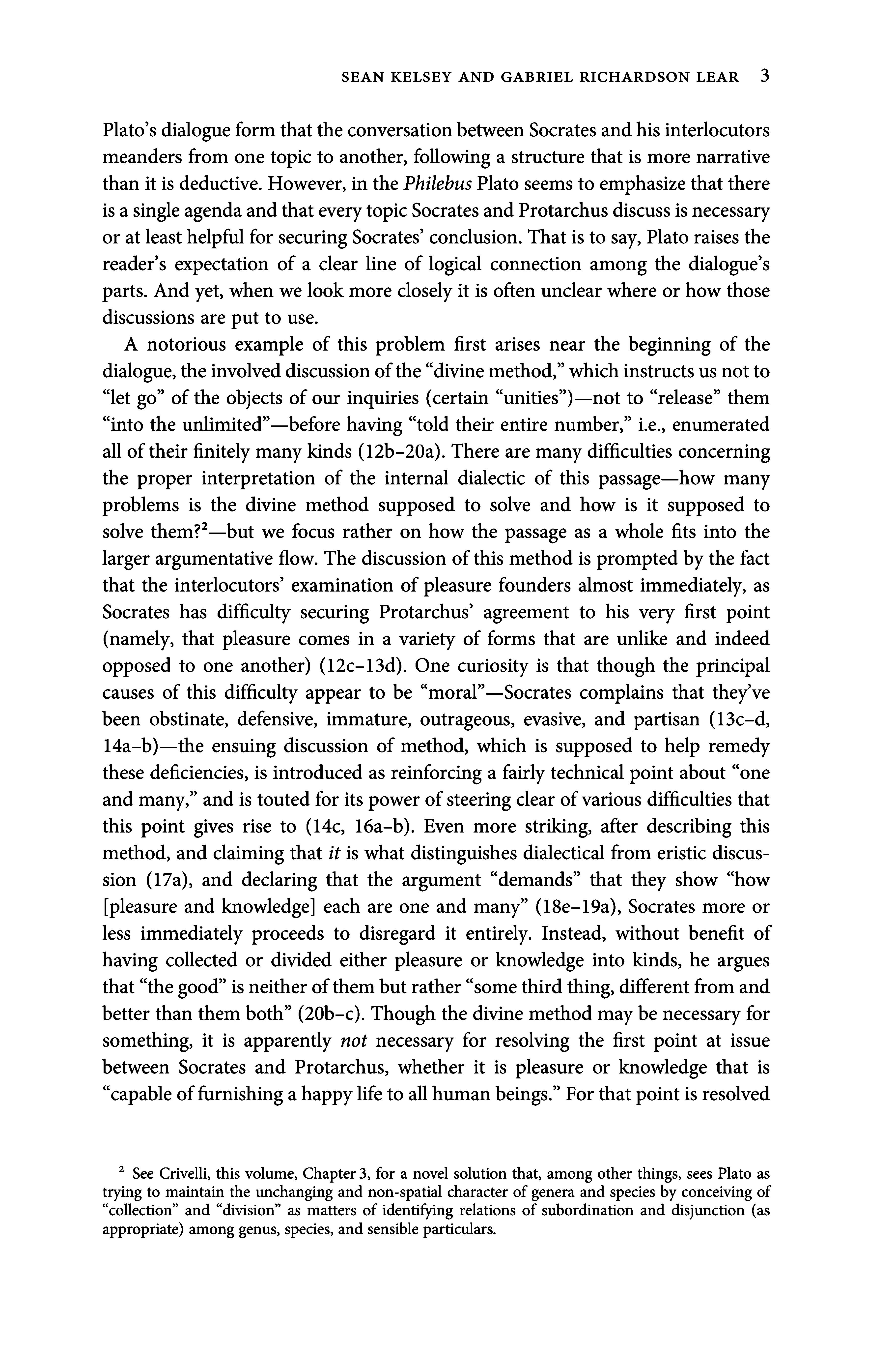 A notorious example of this problem first arises near the beginning of the dialogue,theinvolveddiscussion ofthe divine method, whichinstructs usnotto let go ofthe objects ofour inquiries (certain unities ) not to release them into the unlimited before having told their entire number, i-e., enumerated all oftheir finitely manykinds (12b-20a). There are manydifficulties concerning the proper interpretation of the internal dialectic of this passage how many problems is the divine method supposed to solve and howis it supposed to solve them?? but we focus rather on how the passage as a wholefits into the larger argumentative flow. The discussion ofthis method is prompted by thefact that the interlocutors examination of pleasure founders almost immediately, as Socrates has difficulty securing Protarchus agreement to his very first point (namely, that pleasure comes in a variety of forms that are unlike and indeed opposed to one another) (12c-13d). Onecuriosity is that though the principal causes of this difficulty appear to be moral Socrates complains that they ve been obstinate, defensive, immature, outrageous, evasive, and partisan (13c-d, 14a-b) the ensuing discussion of method, which is supposed to help remedy these deficiencies, is introduced as reinforcing a fairly technical point about one and many, andis touted for its power ofsteering clear ofvarious difficulties that this point gives rise to (14c, 16a-b). Even morestriking, after describing this method, and claiming thatit is what distinguishes dialectical from eristic discussion (17a), and declaring that the argument demands that they show how [pleasure and knowledge] each are one and many (18e-19a), Socrates more or less immediately proceeds to disregard it entirely. Instead, without benefit of having collected or divided either pleasure or knowledge into kinds, he argues that thegood isneitherofthembut rather somethird thing,different from and better than them both (20b-c). Though the divine method maybenecessary for something, it is apparently not necessary for resolving the first point at issue between Socrates and Protarchus, whether it is pleasure or knowledge that is capable offurnishing ahappylifeto all humanbeings. For that point is resolved