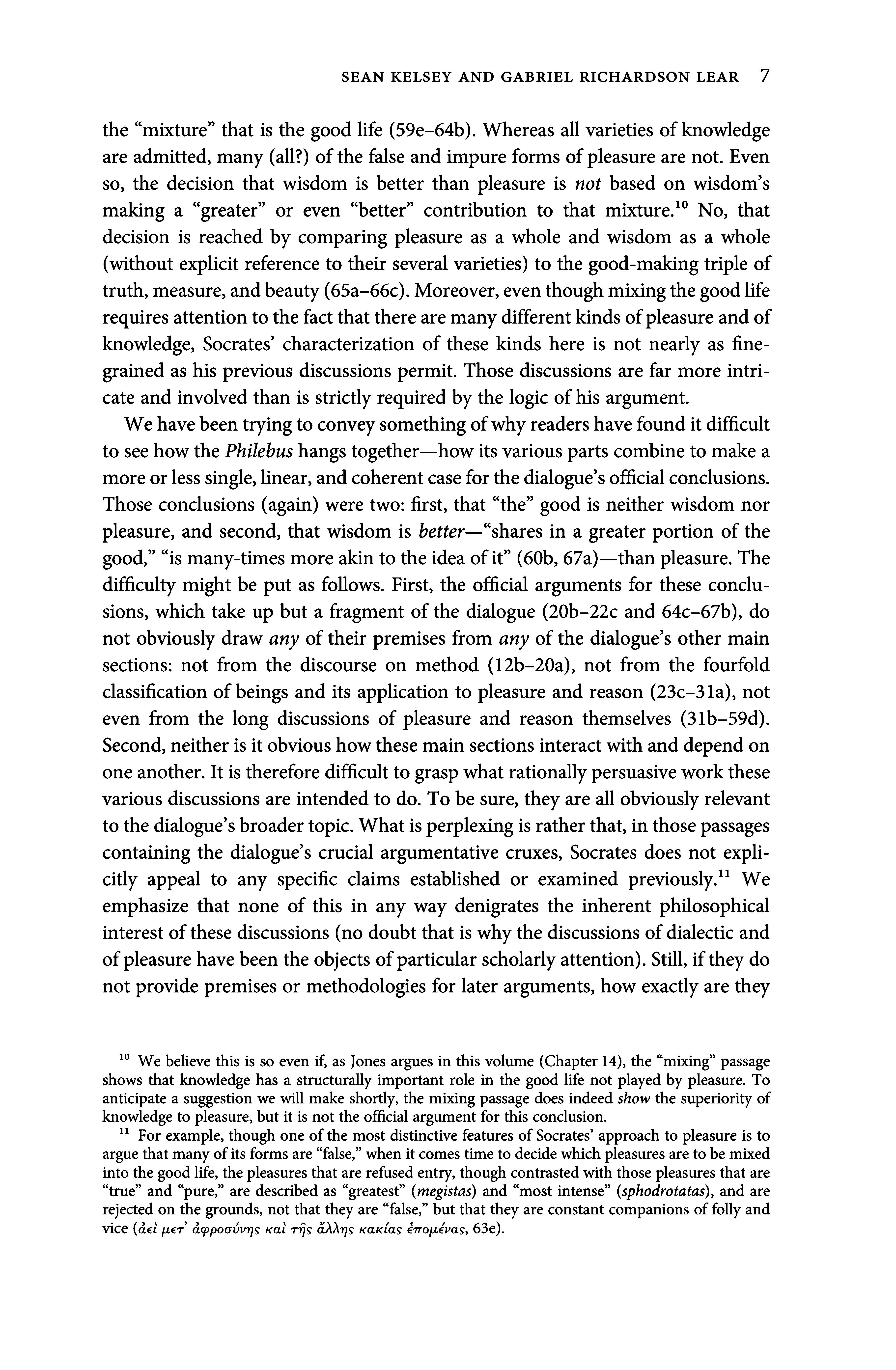 ° Webelieve this is so even if, as Jones argues in this volume (Chapter 14), the mixing passage shows that knowledge has a structurally important role in the goodlife not played by pleasure. To anticipate a suggestion we will make shortly, the mixing passage does indeed show the superiority of knowledgeto pleasure, butit is not the official argument for this conclusion.