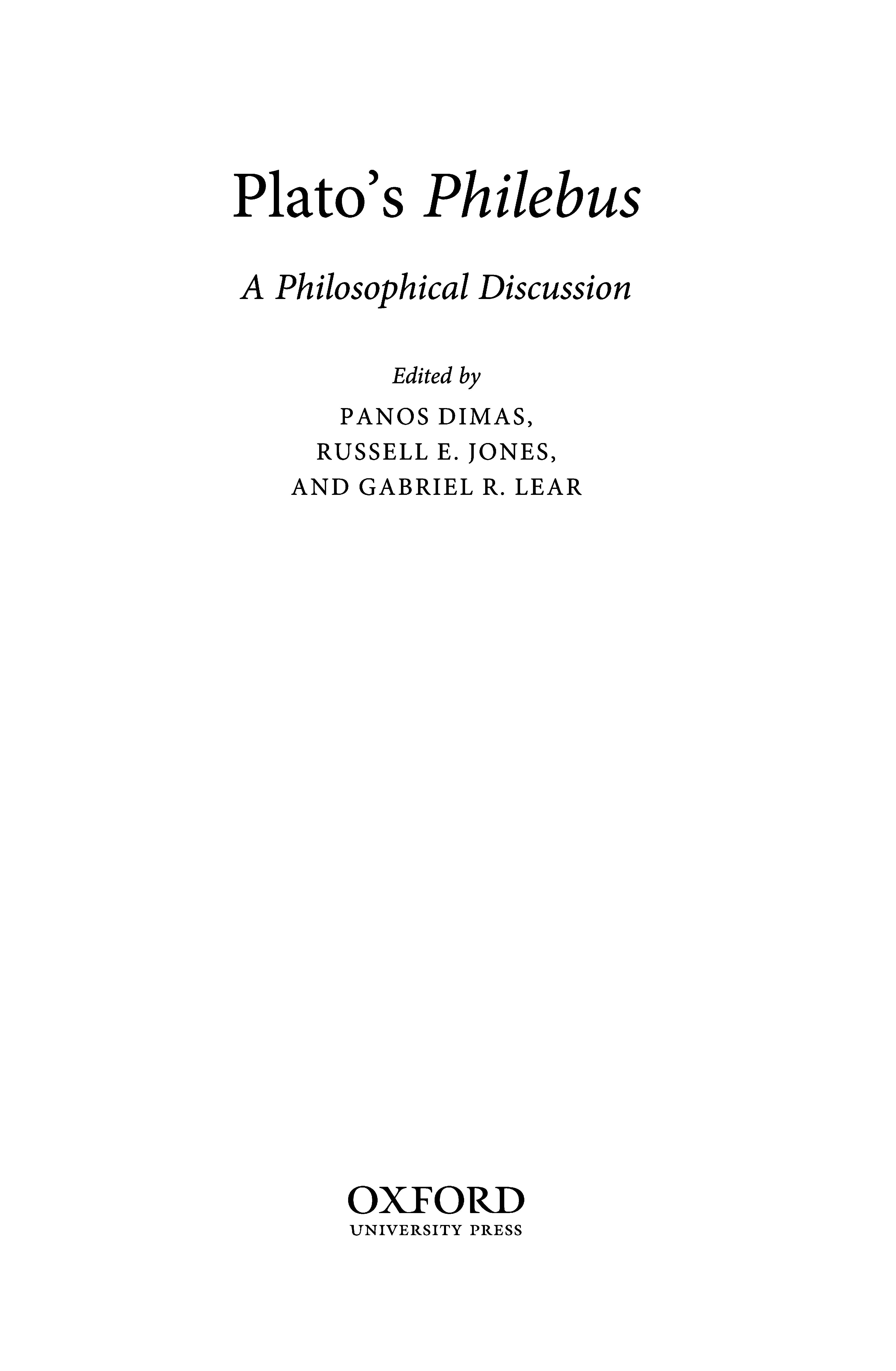 The Plato Dialogue Project hadits first session at the Anargyrios and Korgialenios School in the Isle of Spetses, Greece in September 2015. The Norwegian InstituteatAthenshostedthe meetingandwearegrateful forits support. Thetext chosen was the Philebus and the volumebefore youis the result ofthose deliberations. In addition to the contributors to the volume, the participants included Francesco Ademollo, Paul Kalligas, Keith McPartland, Franco Trivigno, and Marco Zingano.