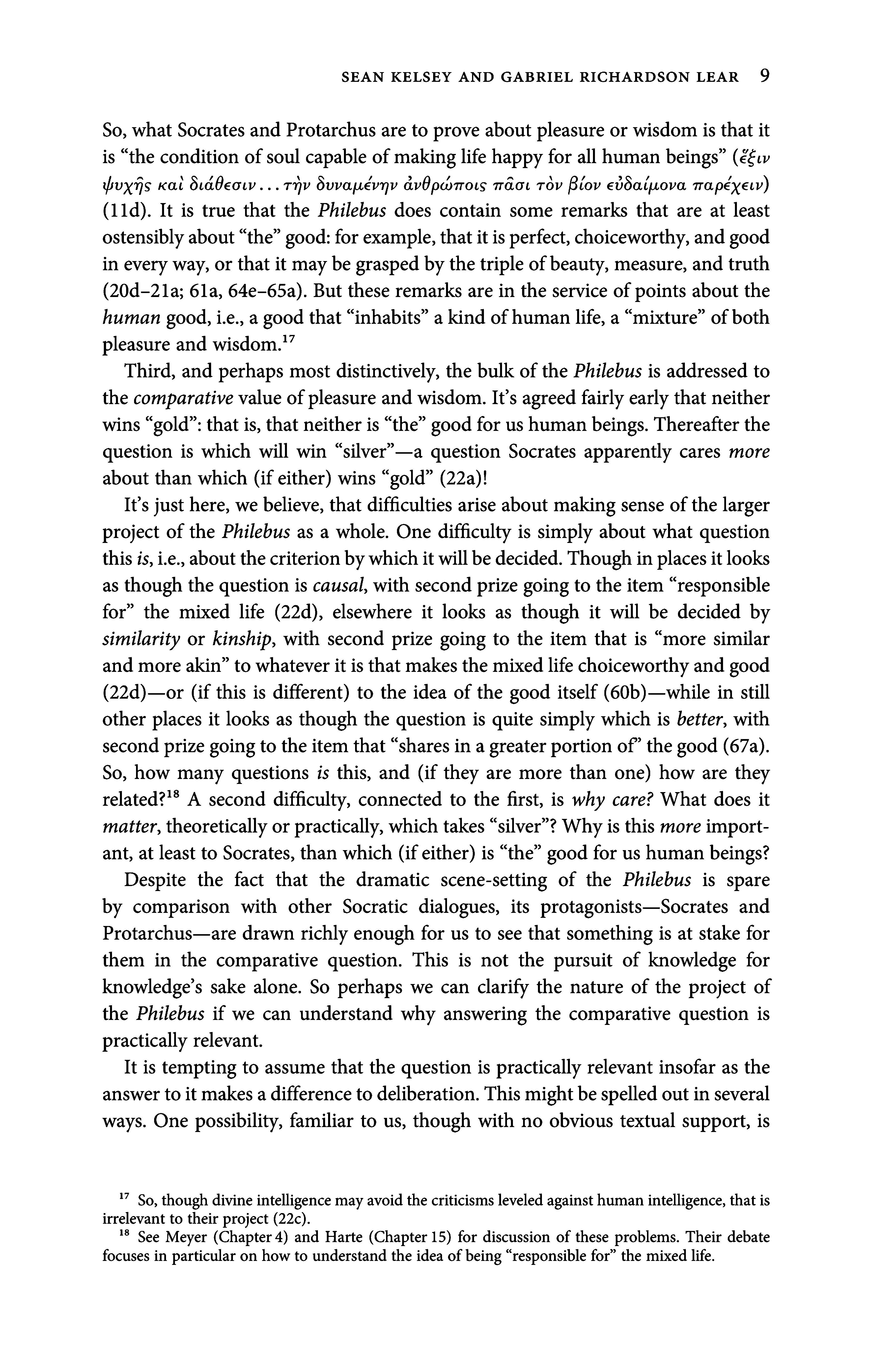 It sjust here, we believe, that difficulties arise about making sense ofthe larger project ofthe Philebus as a whole. Onedifficulty is simply about what question this is,ie., aboutthecriterionbywhichitwillbedecided. Thoughinplacesitlooks as though the question is causal, with second prize going to the item responsible for the mixed life (22d), elsewhere it looks as though it will be decided by similarity or kinship, with second prize going to the item that is more similar andmoreakin towhateverit isthat makes the mixedlife choiceworthyandgood (22d) or(if this is different) to the idea of the good itself (60b) while in still other places it looks as though the question is quite simply which is better, with secondprize goingto the itemthat shares in agreaterportion of thegood (67a). So, how many questions is this, and (if they are more than one) how are they related? * A second difficulty, connected to thefirst, is why care? What doesit matter, theoreticallyorpractically, which takes silver ? Whyis this more important, at least to Socrates, than which(ifeither) is the good for us humanbeings?