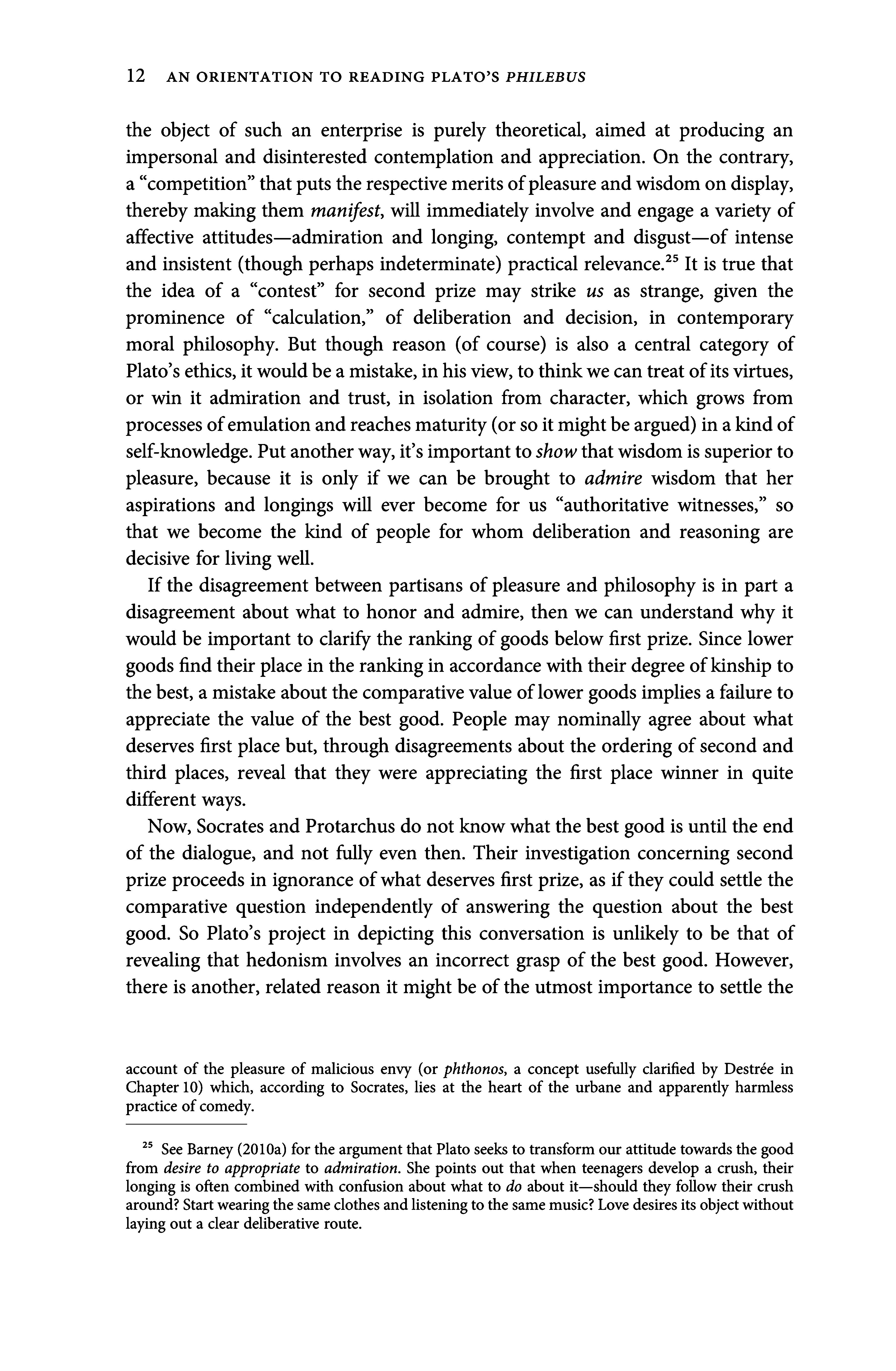 the object of such an enterprise is purely theoretical, aimed at producing an impersonal and disinterested contemplation and appreciation. On the contrary, a competition thatputsthe respectivemeritsofpleasureandwisdomondisplay, thereby making them manifest, will immediately involve and engage a variety of affective attitudes admiration and longing, contempt and disgust of intense and insistent (though perhaps indeterminate) practical relevance. It is true that the idea of a contest for second prize may strike us as strange, given the prominence of calculation, of deliberation and decision, in contemporary moral philosophy. But though reason (of course) is also a central category of Plato sethics, itwouldbeamistake, inhisview, tothinkwecantreatofitsvirtues, or win it admiration andtrust, in isolation from character, which grows from processesofemulation andreachesmaturity (orsoitmightbeargued) inakindof self-knowledge. Put anotherway,it s importanttoshowthatwisdomissuperiorto pleasure, because it is only if we can be brought to admire wisdom that her aspirations and longings will ever become for us authoritative witnesses, so that we become the kind of people for whom deliberation and reasoning are decisive for living well.