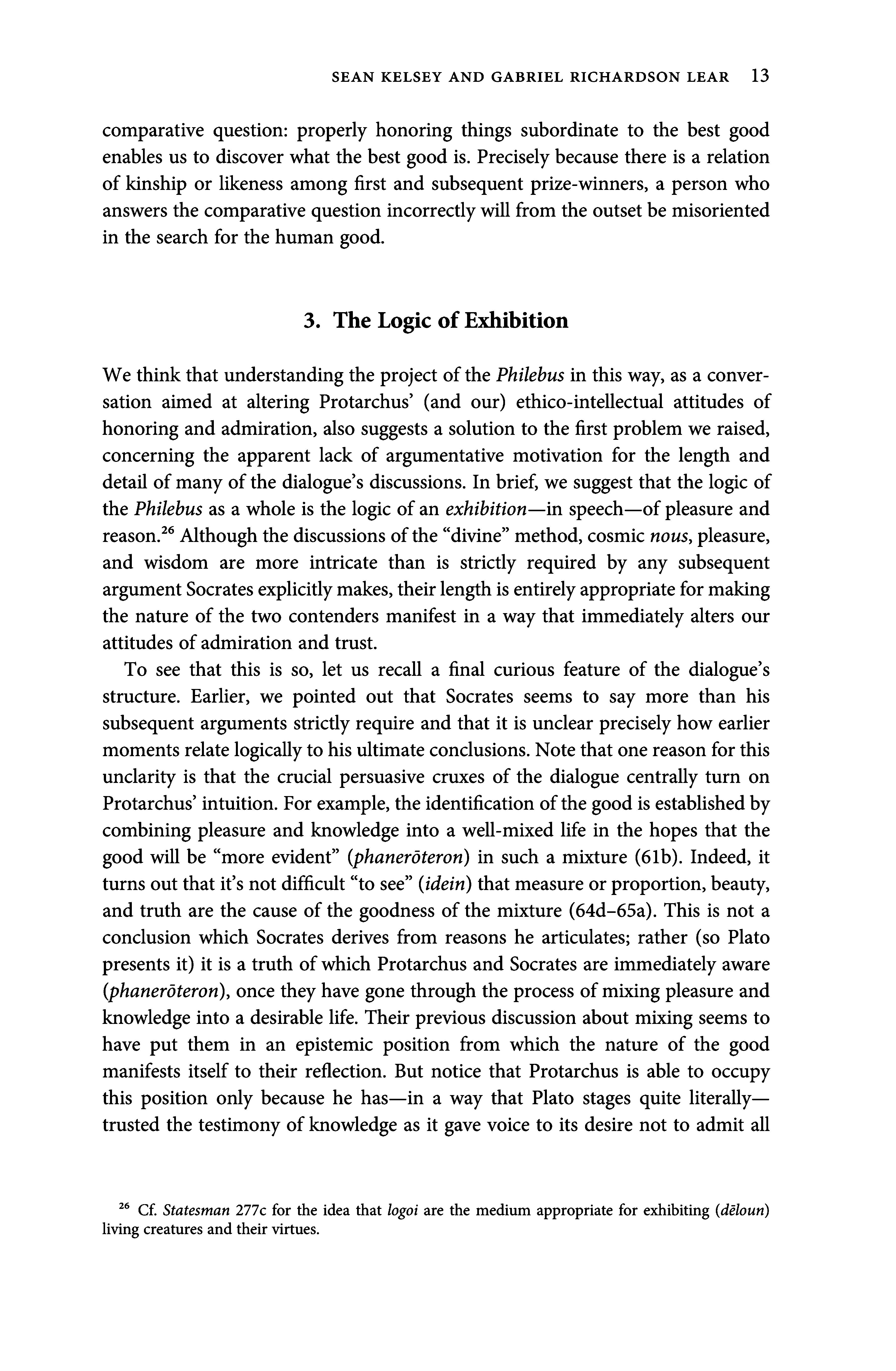 Wethinkthat understanding the project ofthe Philebus in this way, as a conversation aimed at altering Protarchus (and our) ethico-intellectual attitudes of honoring and admiration, also suggests a solution to the first problem weraised, concerning the apparent lack of argumentative motivation for the length and detail ofmany ofthe dialogue s discussions. In brief, we suggest that the logic of the Philebus as a wholeis the logic ofan exhibition in speech ofpleasure and reason. * Although thediscussionsofthe divine method, cosmic nous, pleasure, and wisdom are more intricate than is strictly required by any subsequent argumentSocratesexplicitlymakes,theirlengthisentirelyappropriate formaking the nature ofthe two contenders manifest in a way that immediately alters our attitudes ofadmiration andtrust.