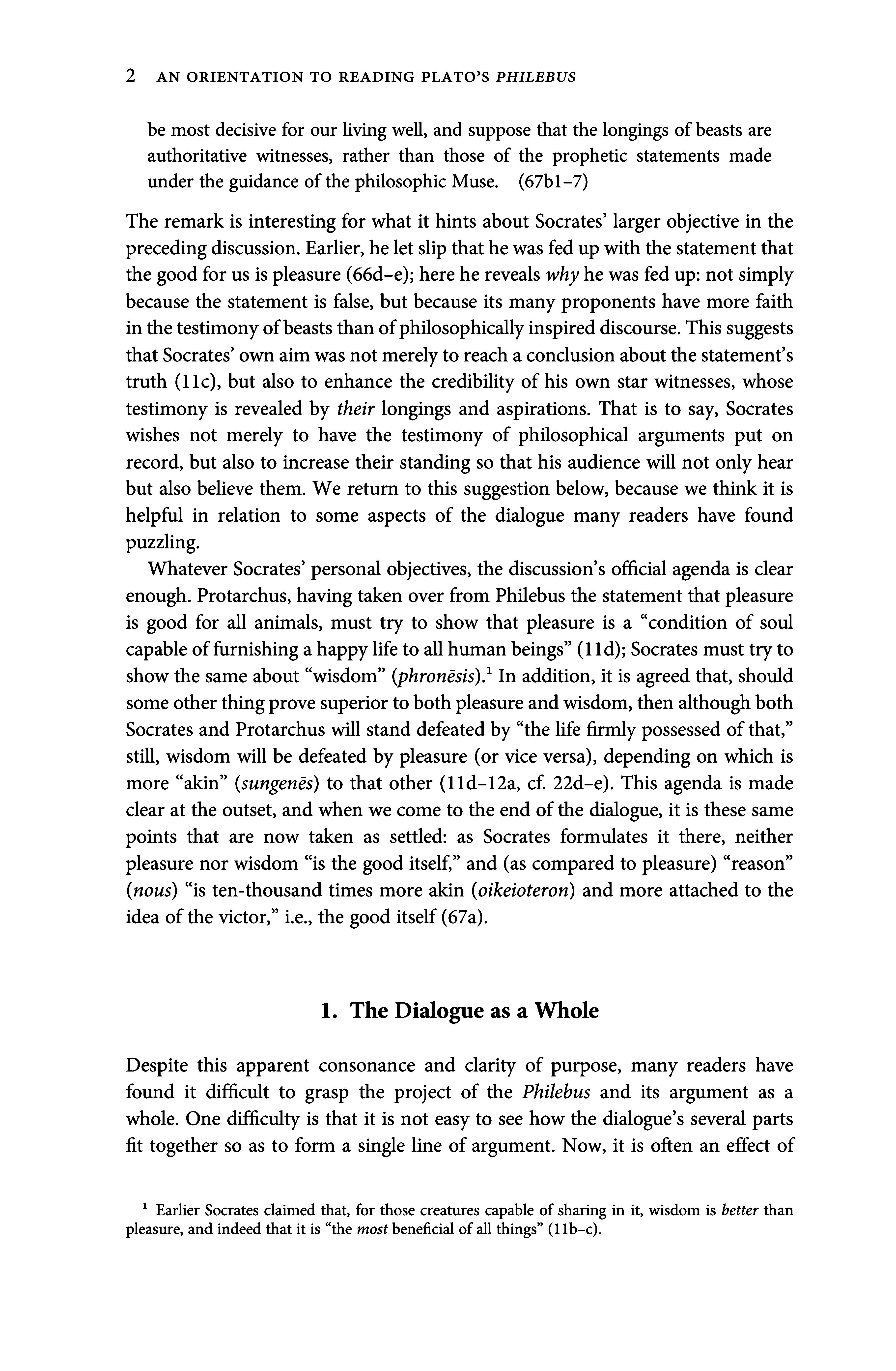 The remarkis interesting for what it hints about Socrates larger objective in the precedingdiscussion.Earlier, helet slip that hewas fedupwith the statementthat the goodfor us is pleasure (66d-e); here he reveals whyhe was fed up: not simply because the statementis false, but because its many proponents have morefaith inthetestimonyofbeaststhan ofphilosophicallyinspireddiscourse. This suggests thatSocrates own aimwasnotmerelytoreacha conclusion aboutthe statement s truth (11c), but also to enhance the credibility of his own star witnesses, whose testimony is revealed by their longings and aspirations. That is to say, Socrates wishes not merely to have the testimony of philosophical arguments put on record,butalso to increase their standing so that his audience will not only hear but also believe them. Wereturn to this suggestion below, because wethinkit is helpful in relation to some aspects of the dialogue many readers have found puzzling.