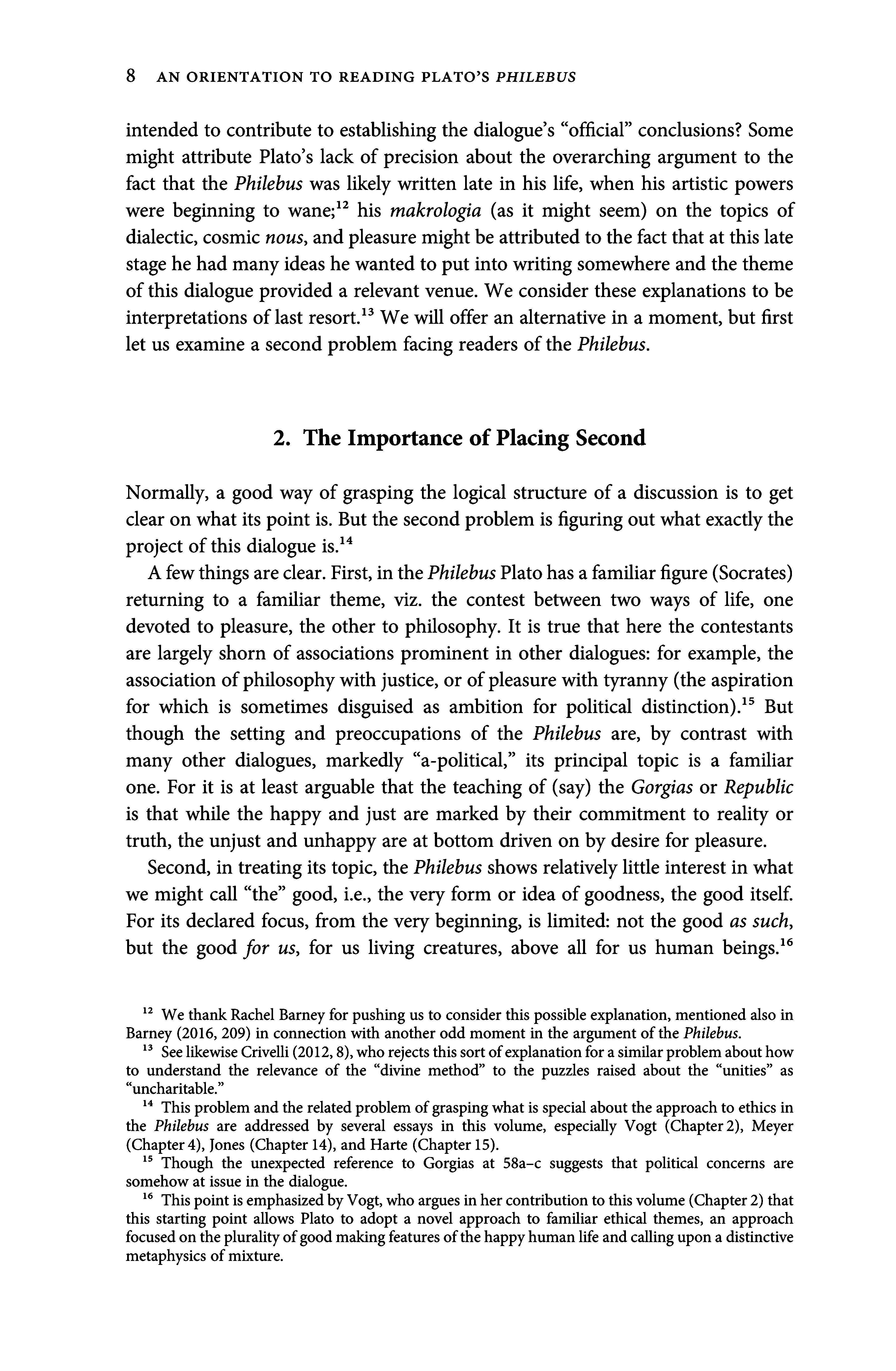 Asthe essays in this volumereveal, the Philebus is an extraordinarily creative and profound work of philosophy, addressing questions of philosophical methodology, moral psychology, ontology, and ethics. We cannotvindicate that claim in a briefintroduction and in any case that is the cumulative work ofthe essays which follow,workwhich it wouldatbestbe redundant to summarize. Instead,in thinking about howto introduce thisvolume, wethought it mightbe useful to say something about how the parts of the dialogue examined in these essays fit together as a whole, both by way ofreminder and because, as we explain below, theargumentativeintegrityofthePhilebusstrikesusaspeculiarlyelusive (afeeling evidentlyshared bymanyreaders). We diagnose two sourcesofthis difficultyand offerasuggestion ourown,notthecontributors abouthowtoorientoneselfto the dialogical whole ofwhich the passages discussed in these essays are parts.