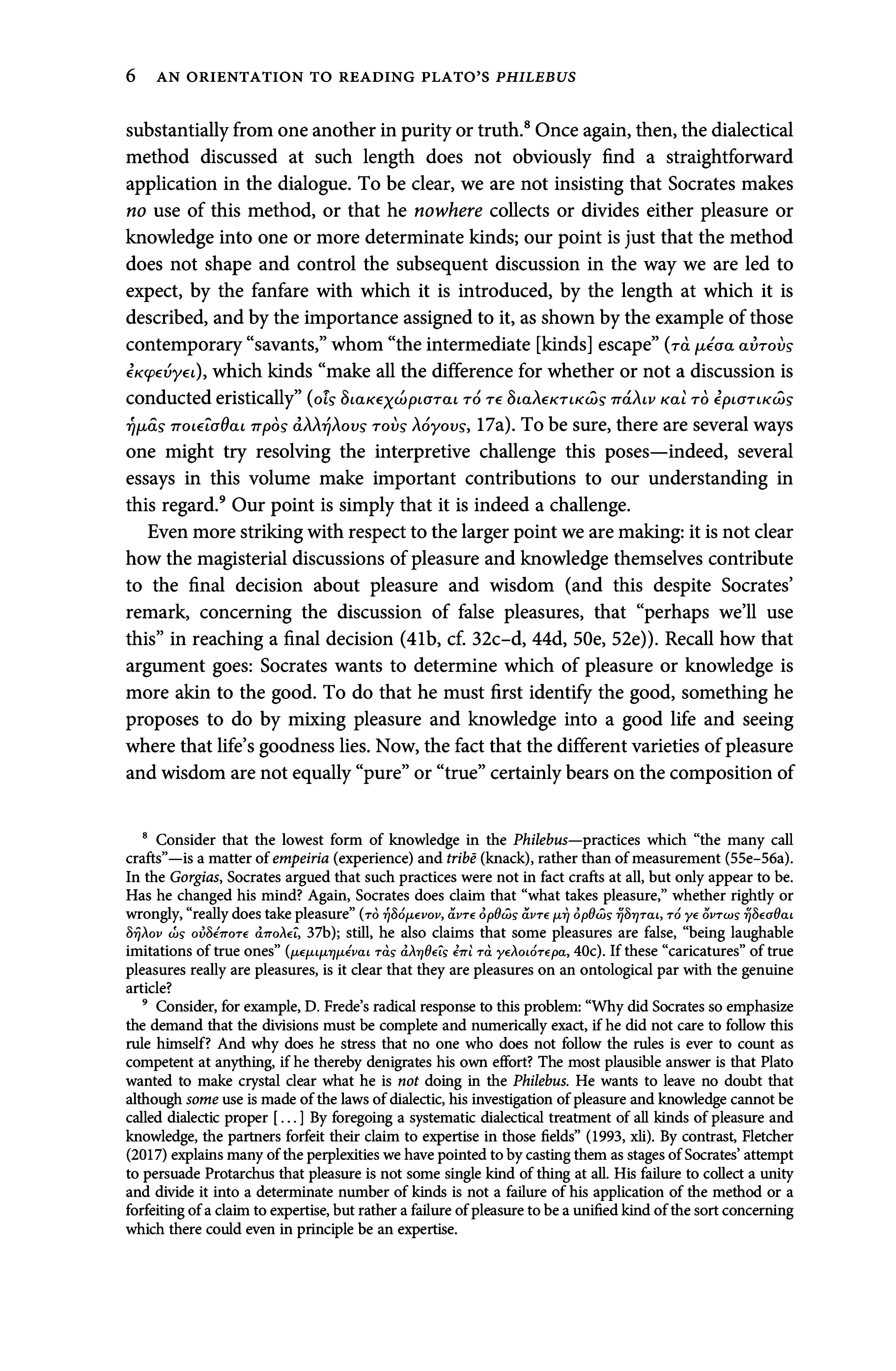 ° Consider, forexample, D. Frede s radical response to this problem: Whydid Socrates so emphasize the demandthat the divisions must be complete and numerically exact, ifhe did not care to follow this rule himself? And why does hestress that no one who does notfollow the rules is ever to count as competentat anything, ifhe thereby denigrates his own effort? The mostplausible answeris that Plato wanted to make crystal clear what he is not doing in the Philebus. He wants to leave no doubt that although someuse is made ofthelawsofdialectic, his investigation ofpleasure andknowledge cannotbe called dialectic proper [...] By foregoing a systematic dialectical treatmentofall kinds ofpleasure and knowledge, the partners forfeit their claim to expertise in thosefields (1993, xli). By contrast, Fletcher (2017) explainsmanyoftheperplexitieswehavepointedtobycastingthem asstagesofSocrates attempt to persuade Protarchus that pleasure is not somesingle kind ofthing atall. His failure to collect a unity anddivide it into a determinate numberofkinds is not a failure ofhis application ofthe method or a forfeitingofaclaimtoexpertise,butratherafailureofpleasuretobeaunifiedkindofthesortconcerning which there could evenin principle be an expertise.