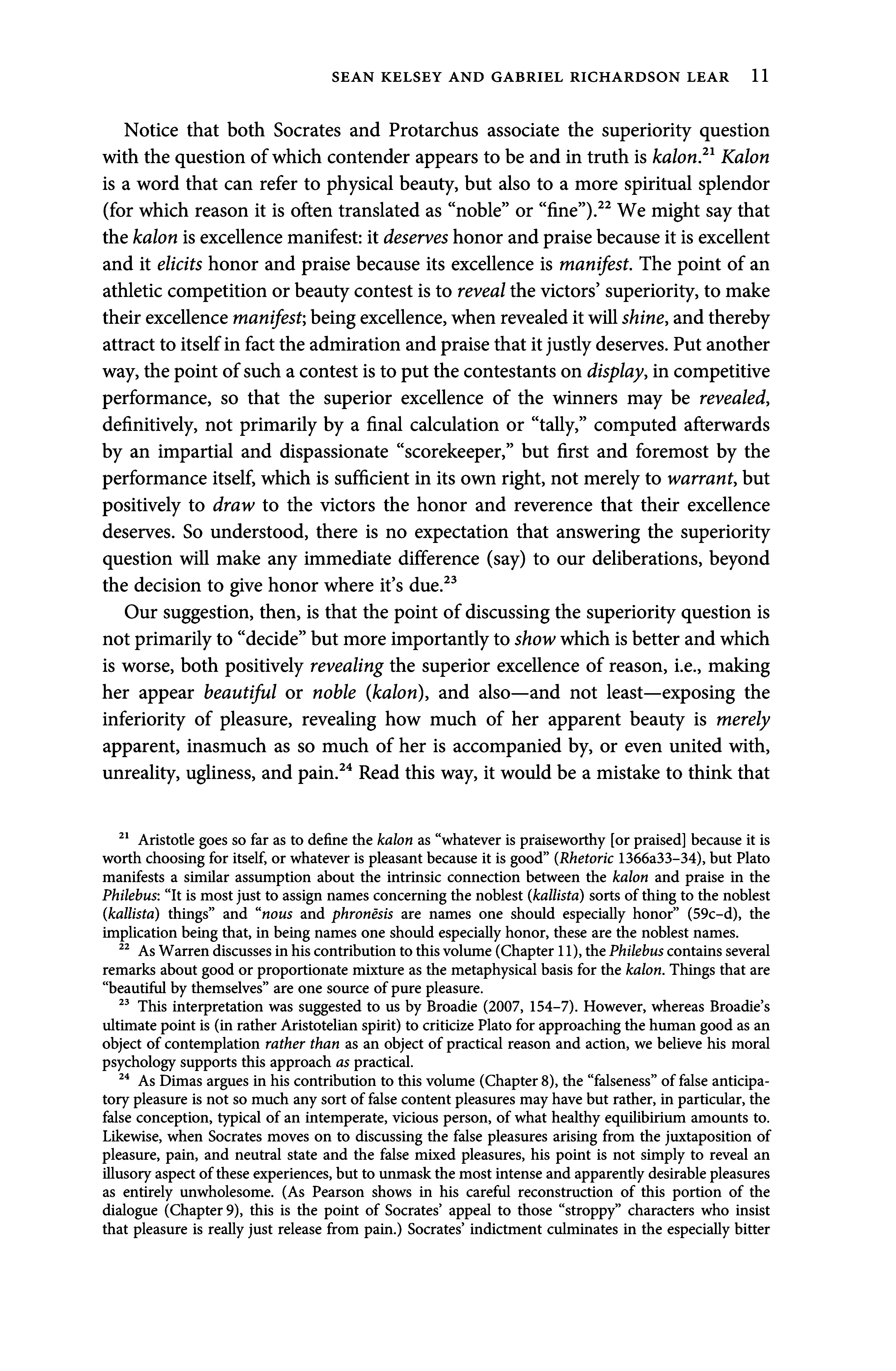 Notice that both Socrates and Protarchus associate the superiority question with the question ofwhich contenderappearsto be and intruth is kalon. Kalon is a word that can refer to physical beauty, but also to a more spiritual splendor (for which reason it is often translated as noble or fine ).?? We might say that thekalon isexcellencemanifest: itdeserveshonor andpraisebecauseit is excellent andit elicits honor and praise becauseits excellence is manifest. The point ofan athletic competition orbeautycontest is to revealthe victors superiority, to make theirexcellence manifest;beingexcellence,when revealeditwillshine,andthereby attract toitselfin facttheadmiration andpraisethatitjustlydeserves. Put another way, thepoint ofsuch acontest istoputthecontestantson display, in competitive performance, so that the superior excellence of the winners may be revealed, definitively, not primarily by a final calculation or tally, computed afterwards by an impartial and dispassionate scorekeeper, but first and foremost by the performanceitself, which is sufficient in its own right, not merely to warrant, but positively to draw to the victors the honor and reverence that their excellence deserves. So understood, there is no expectation that answering the superiority question will make any immediate difference (say) to our deliberations, beyond the decision to give honor whereit s due.