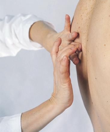 The Stationary Hand. Hyperextend the middle finger of your nondominant hand (the pleximeter) and place its distal portion firmly against the person’s skin. Avoid the ribs and scapulae. Percussing over a bone yields no data because it always sounds “dull.” Lift the rest of the stationary hand up off the person’s skin (Fig. 3-1); otherwise the resting hand will dampen off the produced vibrations just as a drummer uses the hand to halt a drum roll.