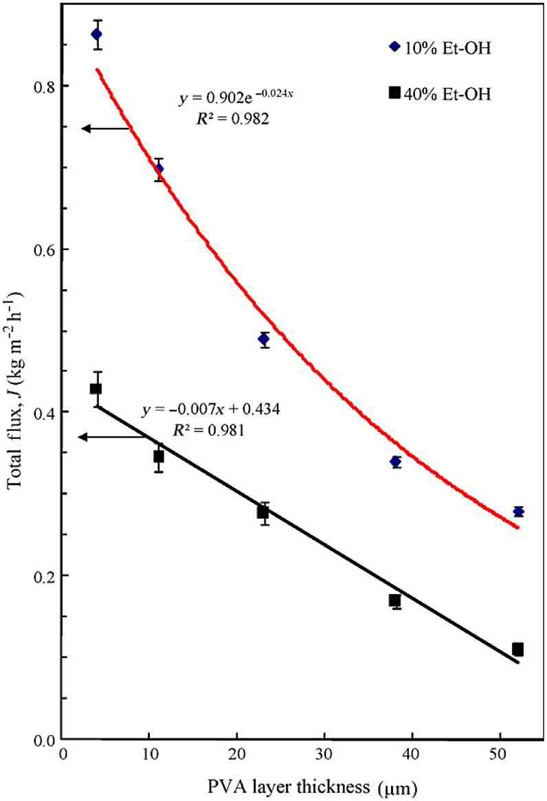 Figure1.5 Totalfluxagainst PVAlayerthicknessfor10% and40%feedethanolmixtures at25˚C. PVA,Poly(vinyl alcohol). Reproducedwith permissionfromM.N.Hyder,R.Y.M. Huang,P.Chen,J.Membr.Sci.318 (2008)387 396,Copyright r 2008 ElsevierB.V.Allrightsreserved.